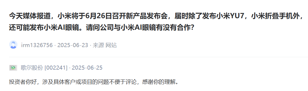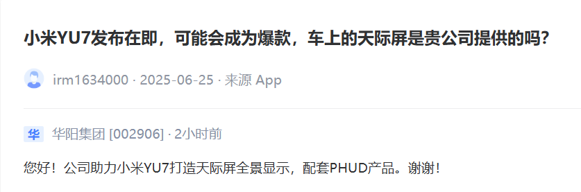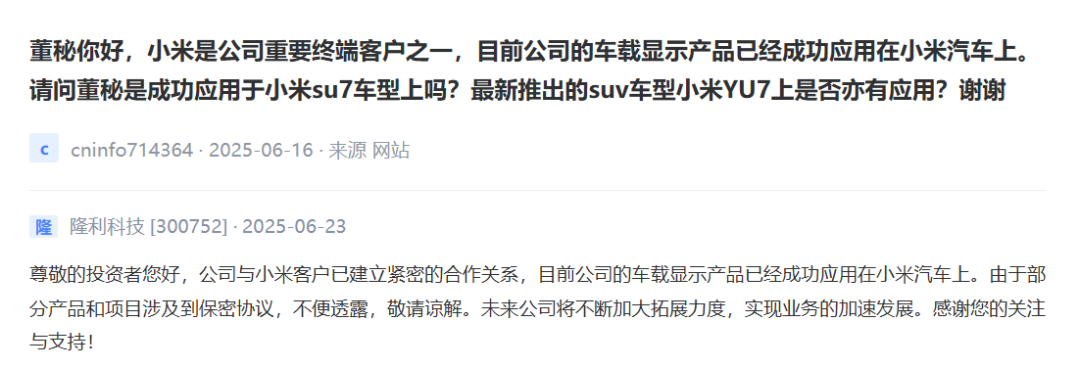 6月26日晚间,小米汽车官微发布消息称,YU7正式发布后3分钟,大定突破20万辆。 ![]() 同时,词条“小米YU7价格”冲上微博热搜榜首位。 ![]() 同日晚间,小米创始人、董事长兼CEO雷军在小米人车家生态发布会上宣布,小米汽车首款SUV车型YU7标准版的售价为25.35万元,比Model Y便宜1万元。 ![]() 小米称此次发布会是其史上内容最丰富的发布会,在连续发布的十几款新品中,由雷军发布的产品是小米AI眼镜、SU7 Ultra纽北限量版、YU7。 ![]() 此外,小米称以技术为本,坚持高端化引领。雷军表示,未来5年(2026年至2030年),小米研发投入预计为2000亿元。 ![]() 小米AI眼镜来了 在小米高管喊出“硬装结束,雷军出场”的口号后,雷军随即返回发布会舞台。 不过,在现场观众期待YU7之际,雷军先发布了小米AI眼镜,宣布定价为1999元起。 雷军称,小米AI眼镜的定位是面向下一个时代的个人智能设备,以及随身的AI入口。 ![]() 据悉,小米AI眼镜搭载1200万像素的高清镜头,可沉浸式拍照、录制视频;支持第三方App视频通话、直播,实时分享,还可以化身开放式耳机。 此前市场传言,小米AI眼镜将全面对标Ray-ban Meta Glasses,搭载AI功能、音频耳机模块、摄像头模块,并且将以小米自有品牌的形式发布。 雷军在发布小米AI眼镜时,对比产品是Ray-ban Meta Glasses。 ![]() 从性能指标来看,小米AI眼镜的重量为40g,典型续航为8.6个小时,单次充满电需45分钟;Ray-Ban Meta Glasses的重量为42g,典型续航为4个小时,单次充满电需75分钟。 此外,市场传言小米AI眼镜由小米与歌尔股份合作打造。 近日,有投资者在互动平台就此询问歌尔股份,但歌尔股份仅回应称涉及具体客户或项目的问题不便评论。 ![]() YU7售价曝光 比亚迪成为首批合作伙伴 雷军在宣布YU7定价时表示,关于YU7售价此前有很多个传言版本,但小米团队昨晚仅用5分钟就确定了YU7售价。 具体来看,YU7标准版售价25.35万元、Pro版售价27.99万元、Max版售价32.99万元。 ![]() ![]() ![]() 由于YU7是小米汽车的首款SUV车型,此前外界对其售价多有猜测,比如YU7标准版比SU7标准版只贵2万元,但是这些猜测均被小米汽车否认。6月26日凌晨,小米汽车方面称,针对YU7售价,公司会给消费者一个合理的价格。 同时,小米汽车决定打造更加开放、全面的人车家全生态,首批合作伙伴包含比亚迪、广汽丰田、郑州日产。 ![]() 小米汽车“A股朋友圈”曝光 在小米人车家发布会召开前夕,投资者在互动平台询问多家上市公司,是否有产品应用于YU7? 华阳集团表示,公司助力YU7打造天际屏全景显示,配套PHUD(全景抬头显示器)产品。 ![]() 泓淋电力表示,目前,公司主要为小米汽车提供便携式电动汽车充放电一体设备。 振邦智能表示,公司通过第三方合作伙伴向SU7、YU7独家提供车载冰箱控制器产品。 部分上市公司以保密条款为由,回避了投资者询问其产品是否应用于SU7和YU7的问题。 隆利科技表示,目前,公司的车载显示产品已经应用在小米汽车上,但部分产品和项目涉及保密协议,不便透露。 ![]() 部分投资者基于SU7销量火爆,并且YU7即将发售,直接询问上市公司的订单是否来得及排产。 浙江华远表示,目前YU7尚未量产,上市及交付时间存在一定的不确定性,但公司已经做好充分准备,有信心应对未来的订单需求。公司将密切关注市场动态,积极争取订单,确保按时交付。 ![]() (文章来源:中国基金报) |