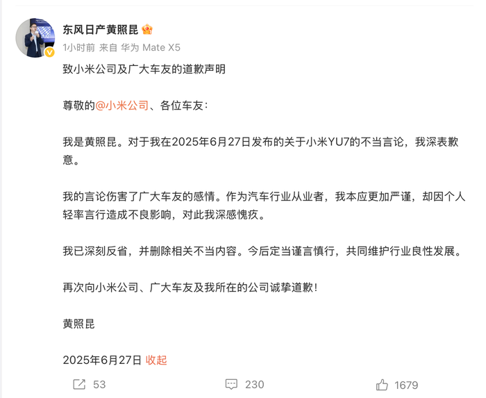 6月27日下午,微博认证为“东风日产新能源黄照昆”的东风日产高管发布道歉声明称,对于其在2025年6月27日发布的关于小米YU7的不当言论,深表歉意。“我的言论伤害了广大车友的感情。作为汽车行业从业者,我本应 ...
