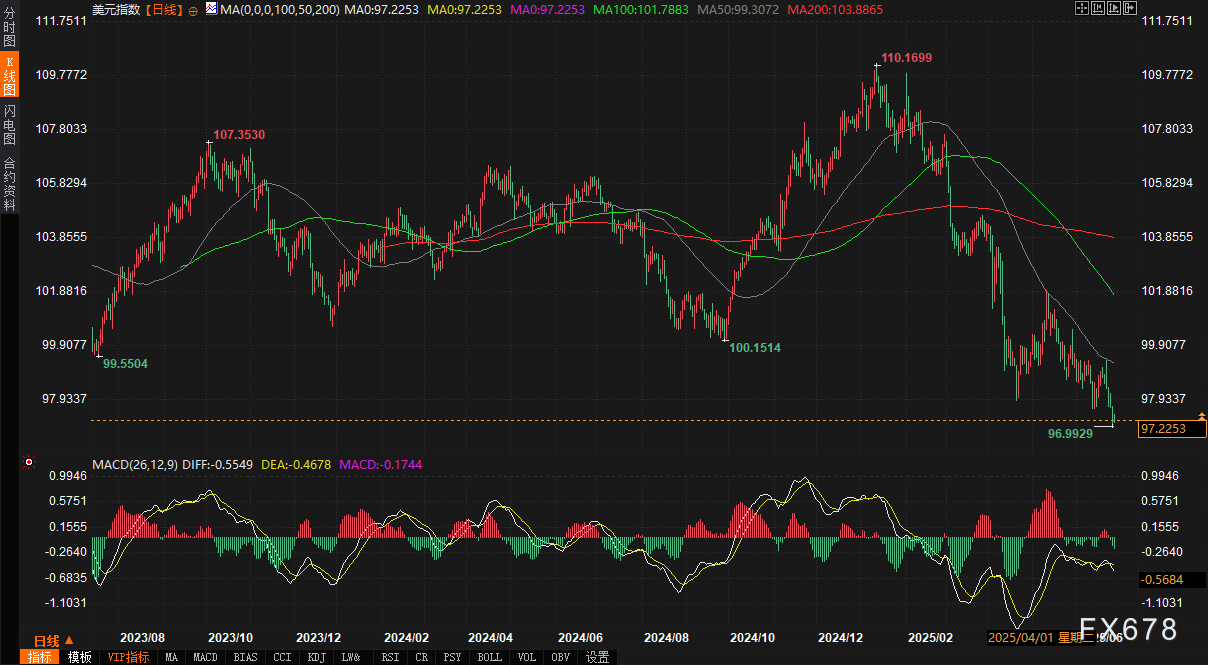 周五 6月27日 美元指数延续弱势整理 技术面呈现空头格局 50日 100日及200日均线分别下压至99 3075 101 7884和103 8866 形成典型空头排列 MACD指标中 DIFF线 0 5548 已下穿DEA线 0 ...