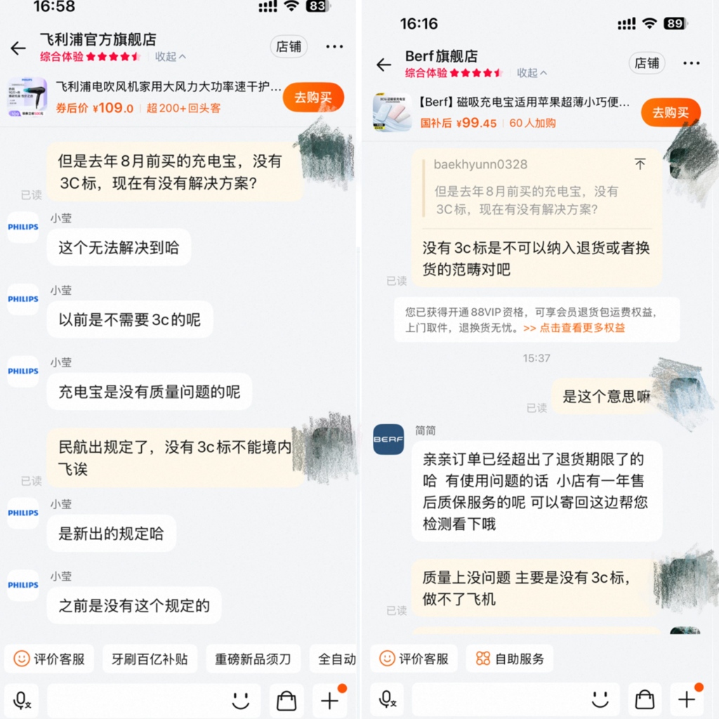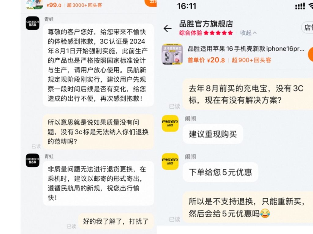 由电芯问题引发的充电宝的质量隐患,一石激起千层浪。 近日,因产品存在过热甚至燃烧的安全隐患,罗马仕、安克创新(300866.SZ)分别宣布召回49万余个、71万余个充电宝,而罗马仕、安克创新、倍思科技、绿联科技等品牌的部分3C认证证书也在近几个月被暂停。6月26日,“中国民航报”微信公号发文称,自6月28日起禁止旅客携带没有3C标识、3C标识不清晰、被召回型号或批次的充电宝乘坐境内航班。 民航局表示,今年以来,旅客携带的充电宝等锂电池产品机上起火冒烟事件多发。近期多个头部品牌充电宝厂家因电芯存在安全风险对多批次产品实施召回,国家市场监管总局撤销或暂停了多个充电宝及电池芯厂家3C认证,上述情况表明旅客随身携带的充电宝存在安全质量隐患,给民航安全运行带来的风险持续增大。 “原本只是个别企业的问题,演变成行业问题。”一位充电宝行业人士说。 值得关注的是,我国是自2023年8月1日起,开始对锂离子电池和电池组、移动电源实施CCC认证管理。经过一年的过渡期后,自2024年8月1日起,未获得CCC认证证书和标注认证标志的相关产品,不得出厂、销售、进口或者在其他经营活动中使用。 从民航局官宣,到实际执行日期,只留了两天时间,社交平台上不少网友开始担心手中充电宝认证问题,毕竟在2024年8月前买的充电宝并未有强制3C标识,购买不到一年,充电宝企业是否有相应的解决措施? 针对无3C认证老款产品,绝大多数品牌无置换方案 倍思、小米、icon、安克、绿联、品胜、飞利浦、酷态科CUKTECH、Berf、罗马仕是较为主流,且在电商平台销量较高的十个品牌,十家品牌的客服人员均向澎湃新闻记者表示,在2024年8月之后生产的产品均已实现3C认证全覆盖。对于国家强制认证之前的产品,客服们多表示"暂无相关通知",或建议消费者按常规售后流程处理,如保修期内可申请更换新品或者领取国补和优惠券重新购买。 商家客服也普遍强调,国家3C认证去年下半年才发布,可能存在此前产品无3C标识,但“并不影响正常使用”。有的客服甚至建议用户:“如果需要充电宝,乘坐飞机时建议邮寄。” 小米客服称,自2024年1月1日起,小米出厂的所有移动电源类产品均已完成3C认证,并在产品本体和包装上明确标注认证标志。对于去年8月前购买、可能尚未印有3C标志的产品,“尚未接到有关补救措施的通知”。如消费者遇到产品质量问题,可提供订单号,按政策妥善处理,可换新。 不过,有媒体报道小米京东自营旗舰店的一款售价89元的“小米(MI)小米充电宝移动电源10000 自带线双向快充口袋版电源蓝灰色”的商品,疑似3C证书已被撤销。至于没有强制3C认证的产品,在证书被撤销后是否可以销售,以及如何查询充电宝的生产日期的问题,客服人员则表示:目前无法在线查询产品的生产日期;部分产品的生产日期可在包装盒白色条形码附近查看(一般位于包装盒的条形码下方)。 Icon表示,2024年8月前的产品确实未印3C标志,在售后方面,该品牌提供一定期限内的换新保障:购买30天内支持退货退款或换新,一年内(非人为损坏)也支持售后换新,但超过一年则不再提供售后支持。客服未提及对“无3C标识但功能正常”的旧款产品有任何专项处理。 ![]() 绿联建议用户自行检查2024年8月之前购买的产品是否具备3C标志,如没有,不建议携带登机,因部分机场可能采取“一律拒检无3C标志产品”的处理方式,但当前暂无替代或补救方案,但若仍在质保期内,可申请正常售后服务。 飞利浦拒绝了记者以老款产品未印有3C标识申请退款的要求,“以前不需要3C,且充电宝无质量问题,不支持以此为理由退换。有质量问题可一年内换新,没有出现质量问题可以一直使用。” 也有品牌称收到相关政策的通知,并给出置换方案。 安克客服表示:“相关政策‘刚刚收到通知’,目前正在内部沟通中。” 品胜客服表示,对于去年8月前无3C标识的产品,建议消费者重新购买,下单可给5元优惠。 社交平台上,有网友晒出倍思客服称,对于客户此前购买的没有3C认证标志的产品,可给予95折复购优惠,但当澎湃新闻向该品牌客服咨询时,该品牌表示,已注意到民航新规,这是突发的航空管控措施,公司产品一直符合国家安全标准。对于去年8月前购买、缺少3C标识的产品,客服表示“尚未接到处理方案的相关通知”。 也有网友质疑倍思旗舰店一款没有3C认证标注的产品在售卖,澎湃新闻将链接发至客服,客服称:“在售充电宝都有3C标识,或在背后,或在侧面。” Berf称:“未印3C标志的订单超出退货期限,无法以无3C标为理由退换,建议重新购买,可参与政府补贴优惠,领取补贴资格至高再减15%。” ![]() CUKTECH酷态科暂无针对印标缺失的额外补救措施,客服建议先观察民航新规后续变化,“如果需要充电宝,乘坐飞机时建议邮寄。” 充电宝问题直指上游供应链 在民航局出台相关规定前,充电宝安全隐患问题已直指上游供应链。问题的焦点并非在于是否有3C认证,而是充电宝的电芯出现问题。 安克创新是国内营收规模最大的全球化消费电子品牌企业之一,也是目前公告召回充电宝最多的企业,该公司在公告中称,在最近的质量安全检查中,发现某供应商部分批次的行业通用电芯,存在未经批准的原材料变更,这可能导致极少数产品在长期循环使用后隔膜绝缘失效,进而引发过热甚至燃烧的安全隐患。 安克对包括A1642 / A1647 / A1652 / A168