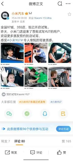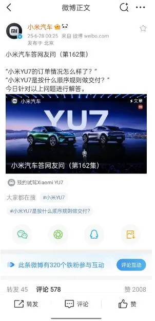 小米汽车深夜发文回应YU7交付规则。今日早间,小米汽车又称,昨天,小米门店迎来了首批试驾YU7的用户。 6月28日凌晨,小米汽车发文答网友问,其中针对“小米YU7是按什么顺序规则做交付?”、“小米YU7什么时 ...