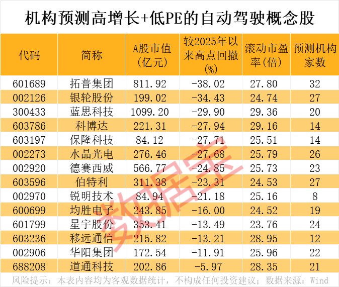 特斯拉完成Model Y全自动驾驶交付。 当地时间6月27日,特斯拉CEO埃隆·马斯克表示,一辆Model Y 已从公司位于奥斯汀附近的工厂全程自动驾驶至客户家中完成交付,这是特斯拉展示其自动驾驶技术进展的最新举措。 马斯克在X上发文称,公司已完成了让一辆特斯拉Model Y从工厂到客户家中的全自动驾驶交付任务。他指出,这次“跨城”交付涉及高速公路行驶,车内没有任何人员,也没有远程操作人员控制车辆。 分析人士指出,特斯拉首次实现的全自动驾驶交付,凸显了马斯克对人工智能和机器人技术将引领其电动汽车公司未来发展的押注。 二级市场上,特斯拉周五股价下跌0.66%,最新总市值1.04万亿美元,最新收盘价与历史高点相比,已回撤33.76%。 自动驾驶产业迎来爆发 新能源汽车从上半场的电动化进入下半场的智能化,自动驾驶正渐行渐近。车百智库研究院副院长黄建平认为,从技术演进看,当前自动驾驶技术已迈向成熟阶段,无图化与AI正推动成本大幅下降;从市场逻辑看,当技术应用的社会效益与经济效益在市场机制中形成正向循环,其价值将获得行业广泛认可。他预测2025~2026年将成为自动驾驶产业爆发期。 《中国智能网联汽车社会实验报告(2025)》认为,作为我国自动驾驶产业发展的“试验田”,各地示范区、先导区和试点城市正成为技术突破与产业培育的关键载体。示范应用规模的扩大将形成技术迭代与公众接受度提升的良性循环,为形成中国特色的L4级自动驾驶规模化应用奠定基础。 业内预计,到2025年,中国智能网联汽车市场渗透率将达到40%以上;到2030年,智能网联新能源汽车将成为市场主流,市场规模有望突破5万亿元。 融资资金大手笔加仓概念龙头 当前A股市场布局自动驾驶产业链的股票众多,截至6月27日收盘,概念股合计A股市值超过3.1万亿元。6月以来融资净买入逾亿元的概念股有6只,分别是江淮汽车、比亚迪、赛力斯、晶方科技、豪威集团、海康威视。 江淮汽车6月以来融资净买入18.93亿元,排在第一位。据公司官网,江汽集团在智能驾驶领域实现了L2+级智能驾驶功能产品的量产,L3级智能驾驶功能开发完成,并于2024年5月份正式获得合肥市的测试牌照,L4级自动驾驶实现特定场景下的常态化示范运营。 比亚迪6月以来融资净买入7.65亿元,排在第二位。公司于2024年推出高阶智能驾驶辅助系统“天神之眼”,适配“仰望U8”“腾势Z9GT”“腾势N7”,稳居高阶智驾第一梯队。 赛力斯6月以来融资净买入7.13亿元,排在第三位。公司深度融合整车控制技术,持续优化智驾体验,实现全维安全进化,搭载的车型获得C-NCAP智驾安全辅助满分、i-Vista先锋首测智能行车G+等权威认可。 ![]() 高增长潜力+低PE概念股出炉 从估值水平来看,截至6月27日收盘,滚动市盈率(PE)低于30倍的自动驾驶概念股有27只。华域汽车滚动市盈率为8.41倍,排在最低位置。公司所属延锋汽车饰件系统有限公司提供综合性智能座舱产品解决方案,并已实现对诸多整车客户及车型的量产配套供货。 数据宝统计,上述27只低市盈率的概念股中,部分股票未来增长潜力较大。根据5家以上机构一致预测,2025年、2026年净利润增速均有望超20%的自动驾驶概念股有14只。蓝思科技、拓普集团、德赛西威、星宇股份、伯特利等细分龙头股名列其中。 以最新收盘价与年内高点相比,上述14股平均回撤幅度达22.54%。拓普集团、银轮股份、蓝思科技、科博达、保隆科技回撤幅度靠前。 以拓普集团为例,该股最新收盘价较年内高点回撤38.02%。华泰证券研报认为,公司收购芜湖长鹏切入奇瑞产业链,内饰件市占率有望进一步提升,未来有望导入更多产品;为问界、小米等头部新势力客户配套空悬等高价值量产品,重点新车型上市后有望贡献收入增量。 ![]() (文章来源:数据宝) |