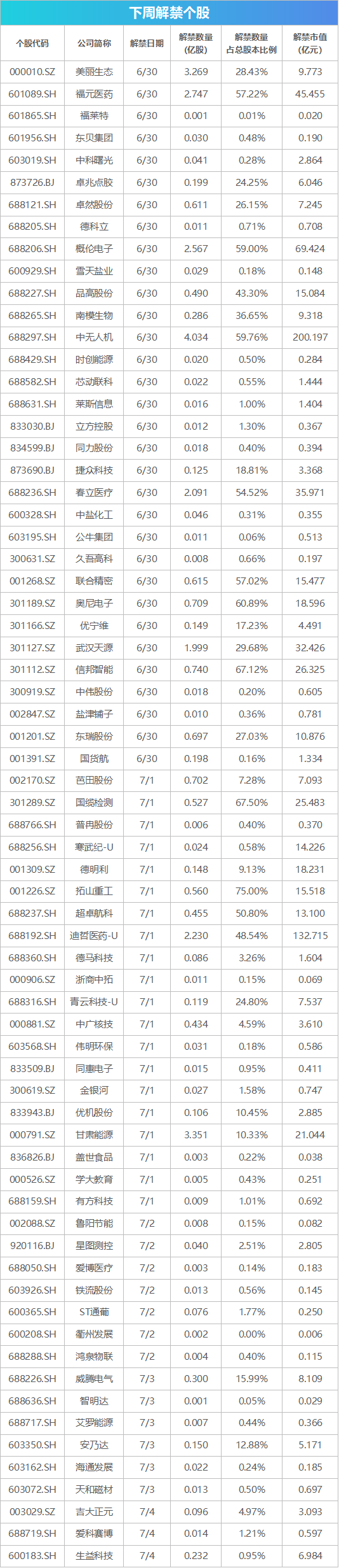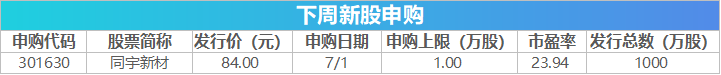 【重磅新闻】 国内成品油开启新一轮调价窗口 新一轮成品油调价窗口将于7月1日24时开启,机构预测,汽柴油价格将上调600元/吨,折算为每升油价上涨0.49-0.51元。按此计算,加满一箱50L的92号汽油,将多花24.5-25.5元。 7月5日上海乐高乐园度假区开园 上海乐高乐园度假区采用六级票价体系(平季日、常规日、特别常规日、旺季日、高峰日、特别高峰日),儿童一日票255元起,成人一日票低至319元。 2025全球数字经济大会7月2日至7月5日在北京举办 2025全球数字经济大会将于7月2日在国家会议中心召开。本届大会将举办新技术新产品新方案“首发首秀”特色活动,并围绕人工智能融合应用、数字安全等新兴领域举办46场专题论坛,全面展现北京建设全球数字经济标杆城市工作成果。 下周超816亿元市值限售股解禁 下周(6月30日-7月4日)A股有68只个股面临解禁,按照最新收盘价计算,对应市值合计超816亿元。其中,中无人机限售股解禁市值超200亿元。 ![]() 【新股机会】 Wind数据显示,下周(6月30日-7月4日)将有1只新股发行,股票简称为同宇新材。该公司拟在创业板上市,主营业务为电子树脂的研发、生产和销售,主要应用于覆铜板生产。 ![]() (文章来源:第一财经) |