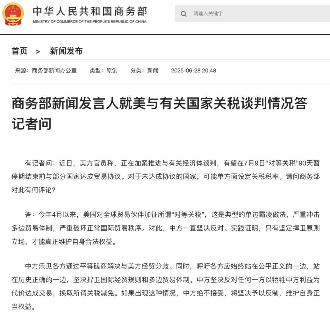 商务部新闻发言人就美与有关国家关税谈判情况答记者问。 有记者问:近日,美方官员称,正在加紧推进与有关经济体谈判,有望在7月9日“对等关税”90天暂停期结束前与部分国家达成贸易协议。对于未达成协议的 ...