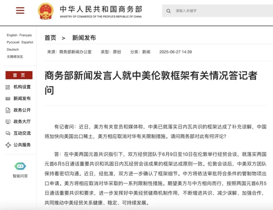 商务部新闻发言人就美与有关国家关税谈判情况答记者问。 有记者问:近日,美方官员称,正在加紧推进与有关经济体谈判,有望在7月9日“对等关税”90天暂停期结束前与部分国家达成贸易协议。对于未达成协议的国家,可能单方面设定关税税率。请问商务部对此有何评论? 答:今年4月以来,美国对全球贸易伙伴加征所谓“对等关税”,这是典型的单边霸凌做法,严重冲击多边贸易体制,严重破坏正常国际贸易秩序。对此,中方一直坚决反对。实践证明,只有坚定捍卫原则立场,才能真正维护自身合法权益。 中方乐见各方通过平等磋商解决与美方经贸分歧。同时,呼吁各方应始终站在公平正义的一边,站在历史正确的一边,坚决捍卫国际经贸规则和多边贸易体制。中方坚决反对任何一方以牺牲中方利益为代价达成交易,换取所谓关税减免。如果出现这种情况,中方绝不接受,将坚决予以反制,维护自身正当权益。 ![]() 更多内容: 商务部新闻发言人就中美伦敦框架有关情况答记者问 有记者问:近日,美方有关官员和媒体称,中美已就落实日内瓦共识的框架达成了补充谅解,中国将加快向美国出口稀土,美方相应取消对华有关限制措施。请问商务部对此有何评论? 答:在中美两国元首共识指引下,双方经贸团队于6月9日至10日在伦敦举行经贸会谈,就落实两国元首6月5日通话重要共识和巩固日内瓦经贸会谈成果的框架达成原则一致。伦敦会谈后,中美双方团队保持着密切沟通。近日,经批准,双方进一步确认了框架细节。中方将依法审批符合条件的管制物项出口申请。美方将相应取消对华采取的一系列限制性措施。期望美方与中方相向而行,按照两国元首6月5日通话重要共识和要求,进一步发挥好中美经贸磋商机制作用,不断增进共识、减少误解、加强合作,共同推动中美经贸关系健康、稳定、可持续发展。 ![]() (文章来源:证券时报) |