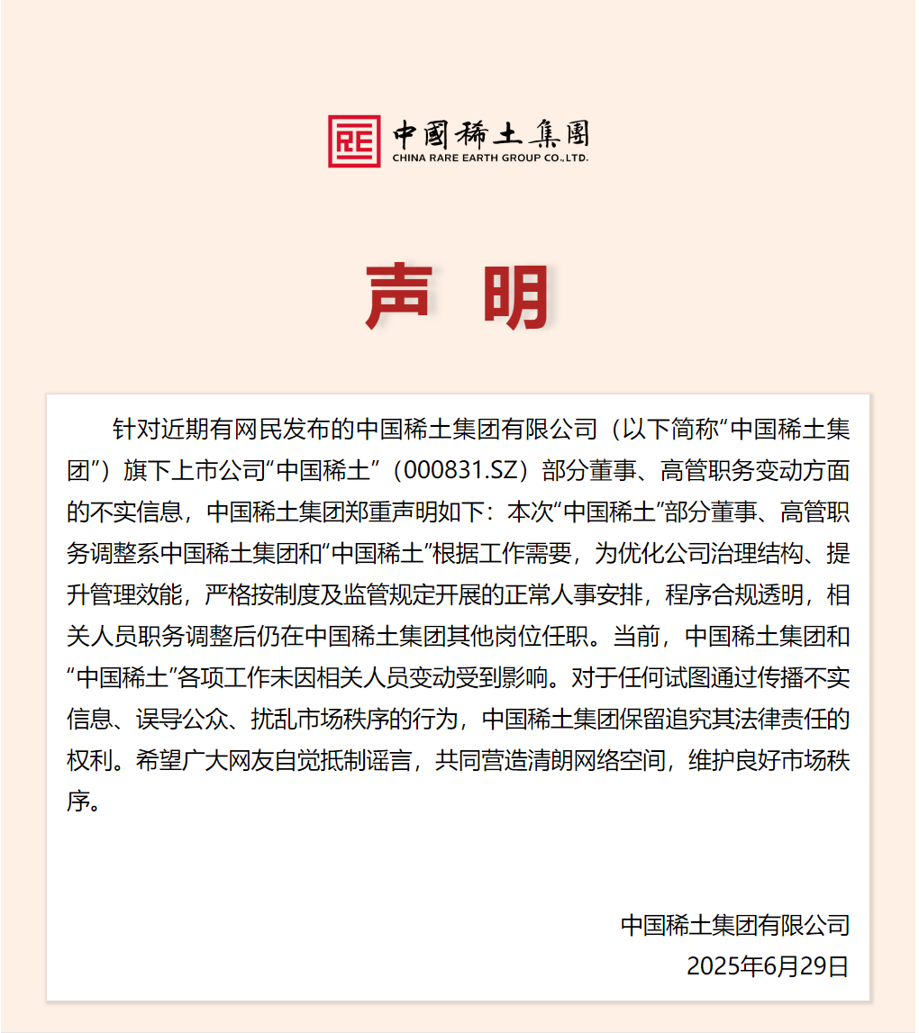 0针对近期网络流传的关于中国稀土(000831.SZ)多位高管离职的不实信息,中国稀土集团有限公司(下称“中国稀土集团”)6月29日在官方公众号发布声明进行辟谣。图片来源:中国稀土集团公众号 声明称,本次“中 ...