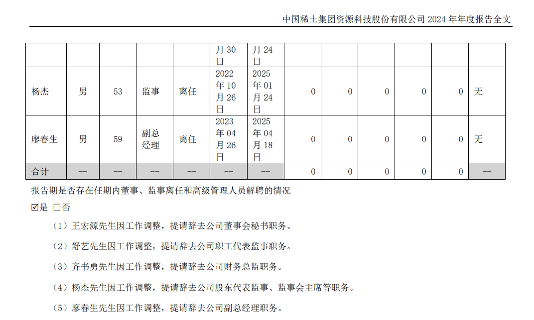 针对近期网络流传的关于中国稀土(000831.SZ)多位高管离职的不实信息,中国稀土集团有限公司(下称“中国稀土集团”)6月29日在官方公众号发布声明进行辟谣。 ![]() 图片来源:中国稀土集团公众号 声明称,本次“中国稀土”部分董事、高管职务调整系中国稀土集团和“中国稀土”根据工作需要,为优化公司治理结构、提升管理效能,严格按制度及监管规定开展的正常人事安排,程序合规透明,相关人员职务调整后仍在中国稀土集团其他岗位任职。当前,中国稀土集团和“中国稀土”各项工作未因相关人员变动受到影响。 财联社记者注意到,上述网络流传的关于中国稀土多位高管职务变动的不实信息,主要内容为近日中国稀土多位高管离职引发了网友对稀土技术外流的担忧。 今年以来,中国稀土管理层人事变动幅度较大。6月,中国稀土发布多条人事变动公告,包括公司总经理、1名副总经理、3位董事先后辞职,辞职原因均为“工作原因”。其中,公司原总经理闫绳健辞去总经理职务后,仍担任公司党委书记、董事等职务;公司原董事杨国安、董贤庭、郭惠浒辞职后皆不在公司担任任何职务。 此前的4月,中国稀土原副总经理廖春生请辞;再往前,公司原财务总监齐书勇、原监事会主席杨杰均于今年1月24日辞职。据公司2024年报,廖春生、齐书勇、杨杰等人请辞是因工作调整。中国稀土在公告中强调,前述高管辞职不会影响公司正常生产经营。 ![]() 图片来源:中国稀土2024年度报告 值得注意的是,前述中国稀土离职董事和高管均属于提前“退场”。2023年4月26日,中国稀土董事会、监事会完成换届选举,杨国安、闫绳健、董贤庭、郭惠浒均为中国稀土第九届董事会非独立董事,其中杨国安担任董事长,闫绳健担任总经理。此外,杨杰担任监事会主席。前述公司董事任期为2023年4月26日至2026年4月26日。 公告显示,中国稀土第九届董事会由7名董事组成,其中非独立董事4名,独立董事3名。 而公司同期的高管还包括财务总监齐书勇,副总经理廖春生、贾江涛,以及董秘王宏源。截至目前,前述中国稀土董监高人员均已离职。这意味着,距离任期结束还有近一年时间,中国稀土第九届董事会非独立董事成员目前仅剩闫绳健继续任职,同期高管团队其他成员全部“出局”。 而在上述中国稀土离职高管中,公司原副总经理廖春生备受关注。 公开资料显示,廖春生生于1965年4月,博士,教授级高级工程师。作为稀土分离技术领域的权威人物,廖春生师从徐光宪院士,后者有“中国稀土之父”之称。廖春生曾任北京大学化学与分子工程学院教师,北京镧素创新科技有限公司总经理,五矿稀土研究院有限公司总经理,五矿稀土股份有限公司总工程师,中国稀土集团资源科技股份有限公司副总经理,中稀(北京)稀土研究院有限公司执行董事、总经理等。 财联社记者关注到,中国稀土集团官方公众号6月28日发布的最新动态显示,廖春生最新的身份为中稀(深圳)研究院有限公司科研技术专家。6月27日,中稀(深圳)研究院有限公司所属企业江西离子型稀土工程技术研究有限公司组织召开技术研讨会,廖春生以中稀(深圳)研究院有限公司科研技术专家的身份参加会议。而中国稀土原副总经理贾江涛,现已转任中稀(深圳)研究院有限公司副总经理。 ![]() 图右抬手者为廖春生,图片来源:中国稀土集团公众号 天眼查资料显示,中稀(深圳)研究院有限公司为中国稀土集团全资子公司,成立于2024年12月,注册资本3亿元。 根据企业官网介绍,中国稀土集团有限公司于2021年12月23日在江西省赣州市成立,是由中国铝业集团有限公司、中国五矿集团有限公司、赣州稀土集团有限公司所属稀土资产重组整合,并引入中国钢研科技集团有限公司、中国有研科技集团有限公司两家科技型企业组建而成,是国务院国有资产监督管理委员会直接监管的股权多元化中央企业。 中国稀土是中国稀土集团核心上市平台,目前主要从事稀土矿、稀土氧化物等产品的生产运营,以及稀土技术研发、咨询服务。通过开采和外购稀土原料等方式进行分离加工,主导产品包括混合碳酸稀土、稀土氧化物混合精矿、高纯的单一稀土氧化物及稀土富集物等。 财务数据显示,今年Q1中国稀土实现营业收入7.28 亿元,同比增长141.32%;归属于上市公司股东的净利润7261.81万元,同比扭亏为盈。 (文章来源:财联社) |