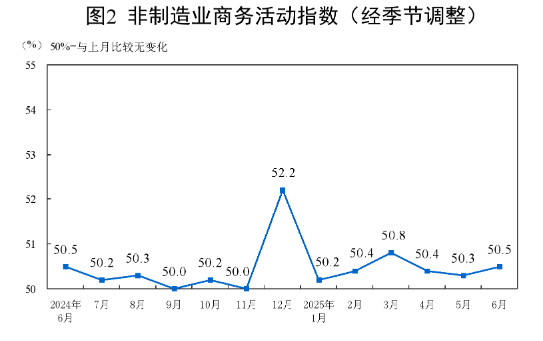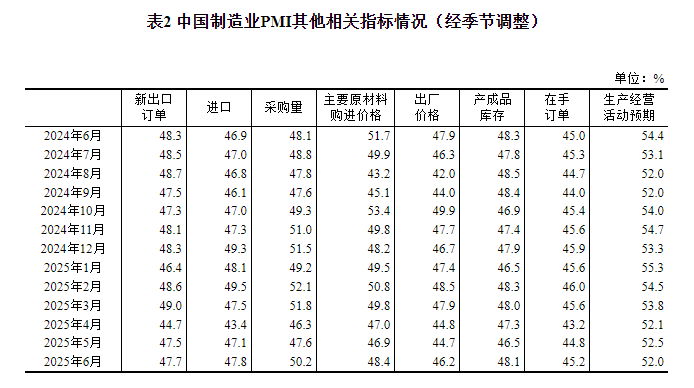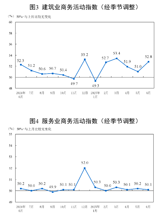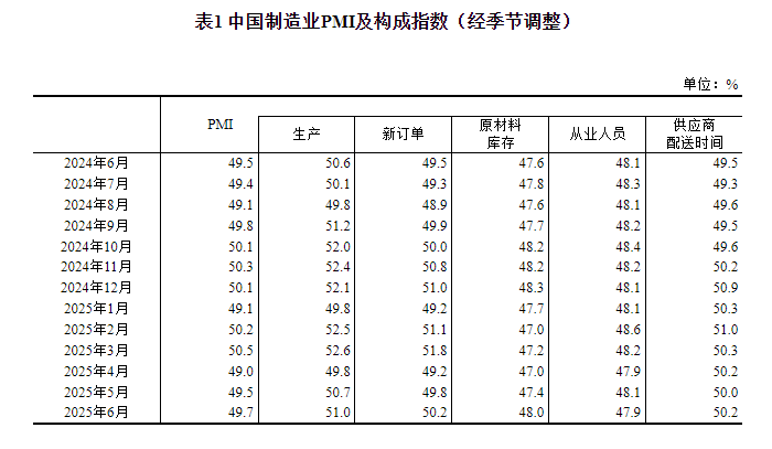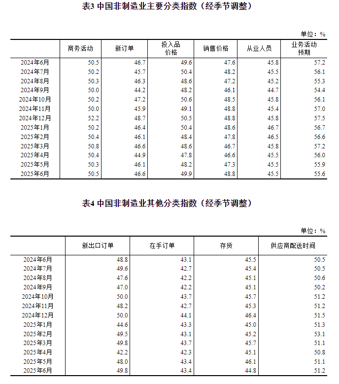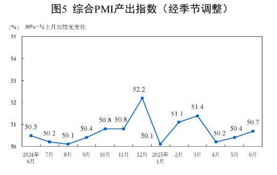 一、中国制造业采购经理指数运行情况 6月份,制造业采购经理指数(PMI)为49.7%,比上月上升0.2个百分点,制造业景气水平继续改善。 ![]() 从企业规模看,大型企业PMI为51.2%,比上月上升0.5个百分点,高于临界点;中型企业PMI为48.6%,比上月上升1.1个百分点,低于临界点;小型企业PMI为47.3%,比上月下降2.0个百分点,低于临界点。 从分类指数看,在构成制造业PMI的5个分类指数中,生产指数、新订单指数和供应商配送时间指数均高于临界点,原材料库存指数和从业人员指数低于临界点。 生产指数为51.0%,比上月上升0.3个百分点,表明制造业企业生产活动加快。 新订单指数为50.2%,比上月上升0.4个百分点,表明制造业市场需求有所改善。 原材料库存指数为48.0%,比上月上升0.6个百分点,低于临界点,表明制造业主要原材料库存量降幅继续收窄。 从业人员指数为47.9%,比上月下降0.2个百分点,表明制造业企业用工景气度小幅回落。 供应商配送时间指数为50.2%,比上月上升0.2个百分点,表明制造业原材料供应商交货时间较上月加快。 ![]() ![]() 二、中国非制造业采购经理指数运行情况 6月份,非制造业商务活动指数为50.5%,比上月上升0.2个百分点,非制造业总体继续保持扩张。 ![]() 分行业看,建筑业商务活动指数为52.8%,比上月上升1.8个百分点;服务业商务活动指数为50.1%,比上月下降0.1个百分点。从行业看,邮政、电信广播电视及卫星传输服务、互联网软件及信息技术服务、货币金融服务、资本市场服务、保险等行业商务活动指数均位于55.0%以上较高景气区间;零售、道路运输、航空运输、住宿、餐饮、房地产等行业商务活动指数均低于临界点。 ![]() 新订单指数为46.6%,比上月上升0.5个百分点,表明非制造业市场需求景气度有所回升。分行业看,建筑业新订单指数为44.9%,比上月上升1.6个百分点;服务业新订单指数为46.9%,比上月上升0.3个百分点。 投入品价格指数为49.9%,比上月上升1.7个百分点,略低于临界点,表明非制造业企业用于经营活动的投入品价格总体水平与上月基本持平。分行业看,建筑业投入品价格指数为48.3%,比上月上升0.3个百分点;服务业投入品价格指数为50.2%,比上月上升2.0个百分点。 销售价格指数为48.8%,比上月上升1.5个百分点,低于临界点,表明非制造业销售价格总体水平降幅收窄。分行业看,建筑业销售价格指数为48.3%,比上月上升0.8个百分点;服务业销售价格指数为48.9%,比上月上升1.6个百分点。 从业人员指数为45.5%,与上月持平,表明非制造业企业用工景气度依然偏弱。分行业看,建筑业从业人员指数为39.9%,比上月上升0.4个百分点;服务业从业人员指数为46.4%,比上月下降0.2个百分点。 业务活动预期指数为55.6%,比上月下降0.3个百分点,继续位于较高景气区间,表明多数非制造业企业对市场发展较为乐观。分行业看,建筑业业务活动预期指数为53.9%,比上月上升1.5个百分点;服务业业务活动预期指数为56.0%,比上月下降0.5个百分点。 ![]() 三、中国综合PMI产出指数运行情况 6月份,综合PMI产出指数为50.7%,比上月上升0.3个百分点,表明我国企业生产经营活动总体扩张有所加快。 ![]() 附注 1.主要指标解释 采购经理指数(PMI),是通过对企业采购经理的月度调查结果统计汇总、编制而成的指数,它涵盖了企业采购、生产、流通等各个环节,包括制造业和非制造业领域,是国际上通用的监测宏观经济走势的先行性指数之一,具有较强的预测、预警作用。综合PMI产出指数是PMI指标体系中反映当期全行业(制造业和非制造业)产出变化情况的综合指数。PMI高于50%时,反映经济总体较上月扩张;低于50%,则反映经济总体较上月收缩。 2.调查范围 涉及《国民经济行业分类》(GB/T4754-2017)中制造业的31个行业大类,3200家调查样本;非制造业的43个行业大类,4300家调查样本。 3.调查方法 采购经理调查采用PPS(Probability Proportional to Size)抽样方法,以制造业或非制造业行业大类为层,行业样本量按其增加值占全部制造业或非制造业增加值的比重分配,层内样本使用与企业主营业务收入成比例的概率抽取。 本调查由国家统计局直属调查队具体组织实施,利用国家统计联网直报系统对企业采购经理进行月度问卷调查。 4.计算方法 (1)分类指数的计算方法。制造业采购经理调查指标体系包括生产、新订单、新出口订单、在手订单、产成品库存、采购量、进口、主要原材料购进价格、出厂价格、原材料库存、从业人员、供应商配送时间、生产经营活动预期等13个分类指数。非制造业采购经理调查指标体系包括商务活动、新订单、新出口订单、在手订单、存货、投入品价格、销售价格、从业人员、供应商配送时间、业务活动预期等10个分类指数。分类指数采用扩散指数计算方法,即正向回答的企业个数百分比加上回答不变的百分比的一半。由于非制造业没有合成指数,国际上通常用商务活动指数反映非制造业经济发展的总体变化情况。 (2)制造业PMI指数的计算方法。制造业PMI是由5个扩散指数(分类指数)加权计算而成。5个分类指数及其权数是依据其对经济的先行影响程度确定的。具体包括:新订单指数,权数为30%;生产指数,权数为25%;从业人员指数,权数为20%;供应商配送时间指数,权数为15%;原材料库存指数,权数为10%。其中,供应商配送时间指数为逆指数,在合成制造业PMI指数时进行反向运算。 (3)综合PMI产出指数的计算方法。综