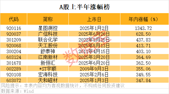 银行指数频创新高。 随着6月30日的钟声敲响,A股2025年上半年的交易正式落下帷幕。回顾上半年,A股在外部波动的风云中稳健前行,展现出强大的韧性。特别是银行指数,屡次刷新历史高点,成为市场的“定海神针”。综合上半年,上证指数年内上涨2.76%,深证成指、创业板指两大指数年内涨幅均在0.5%左右水平,北证50指数更为优异,年内大涨超39%,且一度创出历史新高。 行业板块方面,上半年,31个申万行业板块中有色金属、银行、国防军工、传媒4个板块涨幅超10%,其中有色金属板块上涨逾18%居首位,银行板块涨超13%位居次席,国防军工、传媒板块均涨超12%。 个股方面,上半年约有超3800只个股录得上涨,占比逾七成。包括次新股在内,有多达175只个股股价翻倍(次新股涨幅以最新收盘价和发行价相比)。其中,涨幅前十大个股中,次新股星图测控以1343.72%涨幅居首,另一只次新股广信科技涨幅628.5%次之,涨价题材联合化学上涨437.83%紧随其后。此外,还有天工股份、舒泰神、江南新材等12股涨超3倍。 ![]()