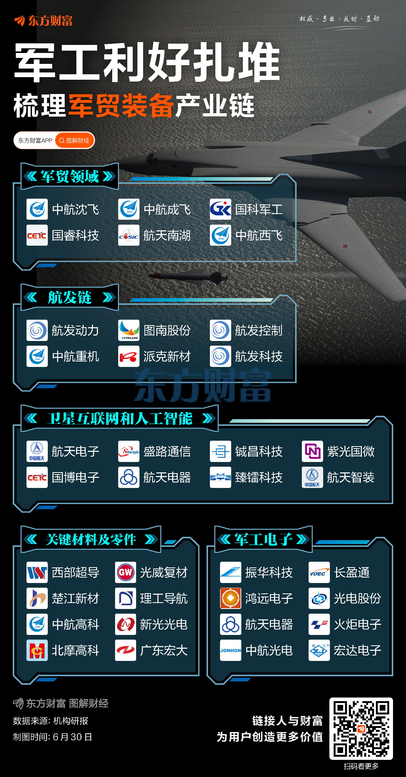 ![]() 周一(6月30日)军工板块再度爆发,军贸方向活跃,国科军工、航天南湖涨超10%,国睿科技涨停,中航成飞、中航沈飞等涨超6%。 消息面上,据央视新闻6月29日晚间报道,当地时间6月28日,德国总理默茨在一份声明中表示,受地区安全形势的变化,在刚刚结束的北约峰会上,北约成员国作出了历史性的决定,未来将国内生产总值(GDP)的5%用于国防,德国将支持北约这一决定。此前的2014年,北约国家元首和政府首脑同意将其国家GDP的2%用于国防开支,因此这一增幅可谓巨大。 此外俄乌局势依然不稳,以伊冲突还有变数,国内阅兵的预期也在发酵当中,军工板块的催化消息可谓是不断。 除了事件性催化预期,行业基本面也有利好,综合机构观点看,军贸有望成为第二增长极。 东方证券研报表示,“十四五”收官之年景气度持续恢复,军贸有望成为第二增长极。当前位置及时点继续看好军工,除了主机厂外,上游元器件和关键原材料作为武器装备研发与生产的底层支撑,其重要性贯穿于导弹、雷达、战机等各类装备的全生命周期,有望充分受益于需求传导的放大效应,迎来更大的业绩弹性。 国泰海通证券表示,全球地缘政治格局加速演变,外贸有望打开军工行业新的增长极,推荐产品或业务与出口密切相关企业。在大国博弈加剧的背景下,加大国防投入是当今时代的必选项,内需和外贸有望驱动军工行业高景气度,保持发展趋势长期向好。 中信证券表示,我国多种出口装备的优异表现助力我国产品得到外军认可。我国军贸正从过去的低档廉价外销逐渐向高端武器出口过渡,尤其是在近年国产装备大批量更新换代背景下,部分军品技术在国际上已具备较强的竞争力。未来随着我国国际政治地位逐渐提升,国产军贸产品有望进一步提升全球市占率。 也有机构观点表示,展望2025年,军贸和军用技术转化带来的新市场等方向或蕴含更大弹性。此外,我国军工企业在无人机、战机等领域的技术优势凸显,成为军贸主要增量,航空航天板块是核心受益方向。未来投资军工,要更加关注抢占“制空权”。