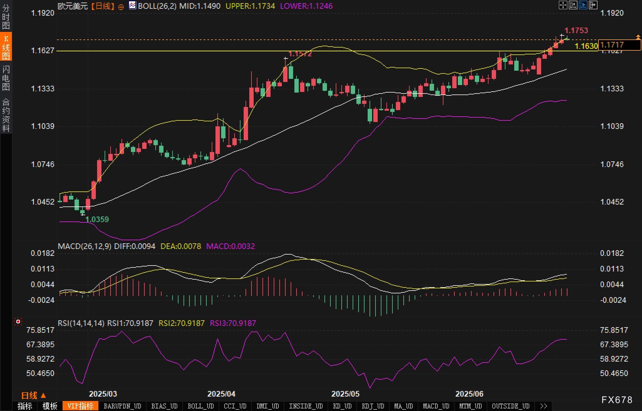 欧元兑美元汇价在上周创下1.1753的多年高点后,周一(6月30日)欧洲时段维持在1.172附近震荡盘整。近期围绕美国与多国贸易谈判取得进展的消息,激发了市场对主要协议可能达成的乐观预期,令避险美元承压。此外,美国参议院推进的万亿美元级减税法案以及对美国债务规模迅速扩张的担忧,持续为美元施压,推动欧元维持强势。 ![]() 技术面: 从日线图来看,欧元兑美元维持在明显的上升趋势中。汇价自低点1.0359启动反弹,并在6月下旬突破1.1630前期阻力,上行至1.1753,录得阶段性新高。图中布林带呈现开口放大形态,布林上轨在1.1734附近,布林中轨支撑上移至1.1490,显示多头趋势未改。分析认为若后续汇价站稳1.1734水平,则有望继续测试并突破1.1753高点,进一步指向心理关口1.1800。 ![]() 综合来看分析认为,技术面延续上升通道,布林通道开口+MACD金叉共振强化多头市场情绪,但短期指标超买,或存在盘整消化的需求。 市场情绪观察 分析认为目前市场整体维持风险偏好,追逐高收益资产的情绪依然浓厚。随着美国与多国谈判进入相对平稳期,以及对美联储9月降息预期的进一步升温,驱动美元流动性边际宽松,利好欧元等主要货币。恐惧与贪婪指数显示情绪偏向贪婪,需留意若后续数据或事件催化不及预期,可能引发短线多头踩踏的情绪修正。 后市展望 短期看,分析认为若欧元兑美元继续持稳于1.1734上方,则有望进一步打开上行空间,测试1.1800及1.1850区域的潜在阻力。然而需关注RSI超买水平可能触发的短线回测,若回撤不破1.1630,预计仍将吸引买盘入场。 分析认为从中长期维度看,在美联储降息预期持续发酵的背景下,欧元有望维持偏强运行态势。不过,若后续美国核心通胀持续超预期回升,或美联储官员在随后的讲话中转鹰,则汇价或面临重新测试布林中轨1.1490及下方支撑带的风险。 ![]() |