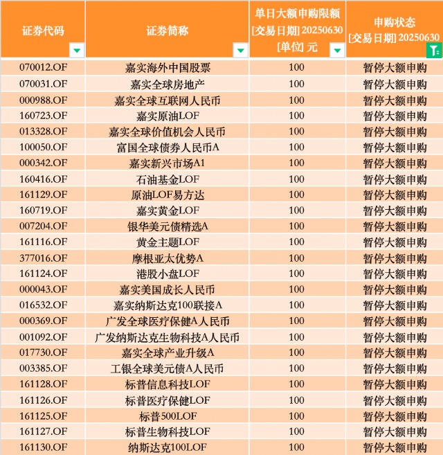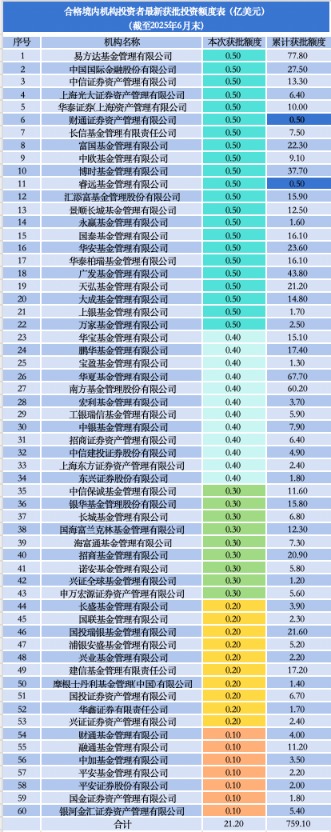 时隔一年多后,新一轮QDII额度又一次集中获批。 6月30日,据国家外汇管理局披露的最新合格境内机构投资者(QDII)投资额度审批情况表,截至2025年6月末,累计批准额度由此前5月末时的1677.89亿美元提高至1708.69亿美元,增加了30.8亿美元。而上一次集中获批还是在2024年5月。 22家机构获得5000万美元的最高QDII额度 基金公司、券商为此次获批的主要机构,其中有60家证券类机构合格境内投资者批复了合计21.2亿美元的QDII额度,包括44家基金公司、11家券商资管以及5家证券公司,每家机构的获批额度则在1000万美元至5000万美元之间不等。 ![]() 具体来看,易方达基金、广发基金、富国基金、博时基金、华安基金、财通资管、睿远基金等22家机构每家各获得5000万美元的QDII额度。值得一提的是,财通资管和睿远基金在2025年6月首次获批QDII额度。 此外,华夏基金、南方基金、工银瑞信基金等12家机构各获得4000万美元的QDII额度;招商基金、兴证全球基金、银华基金等9家机构各获得3000万美元的QDII额度;摩根士丹利基金、建信基金等10家机构各获得2000万美元的QDII额度;平安基金、财通基金等7家机构各获得1000万美元的QDII额度。 另从累计获批额度来看,易方达基金以77.80亿美元的QDII获批额度居首;华夏基金、南方基金紧随其后,累计获批QDII额度分别为67.70亿美元、60.20亿美元;广发基金、博时基金累计获批的QDII额度则均在35亿美元以上。 ![]() 仍有超四成QDII暂停大额申购 而伴随着投资者跨境投资需求增长,QDII基金规模不断走高。根据基金业协会披露数据,截至2025年5月末,全市场QDII基金最新资产净值规模达到6542.78亿元,相比2024年末增长了429.60亿元,增幅达到7.03%。 在新一批QDII额度的获批下,6月28日以来,国泰基金、汇添富基金、万家基金、大成基金等多家基金公司旗下QDII放开限购额度。如万家纳斯达克100指数公告称,取消单日申购限额100元的限制,设置基金总规模上限为人民币8亿元,而此前一季度末该基金规模为5.07亿元;汇添富全球汽车产业升级混合(QDII)单日申购限额从5000元调整至10万元。 不过,QDII整体的投资空间依旧十分有限。澎湃新闻记者据Wind数据统计,截至2025年6月30日,全市场共有311只QDII基金(仅计算初始基金),其中有12只QDII已暂停申购,有132只QDII暂停大额申购。 具体来看,有25只QDII单日申购上限为100元,包括嘉实海外中国股票、黄金主题LOF、原油LOF易方达、港股小盘LOF、纳斯达克100LOF等;另有华安三菱日联日经225联接A、华安法国CAC40联接A、华安纳斯达克100联接A、广发纳斯达克100联接A这4只QDII单日限购300元。 ![]() 三季度全球市场投资机会如何? 步入三季度,外围市场投资机会如何? 中信建投海外经济与大类资产首席钱伟分析道,标普500在2月中旬触顶后,先后经历3月上旬(DeepSeek冲击)和4月上旬(关税冲击)两波大跌。此后,美股开启修复进程,在贸易缓和、降息预期、经济韧性等利多催化下,于本周再创历史新高。历史经验看,历次新高后,美股短期下跌概率并不会增加,但从季节性、经济、盈利估值等维度看,8月前后仍不排除回撤,届时或提供更好的上车窗口。 中信证券表示,美股方面,“Double put”叙事仍存,美股在下半年有望回归基本面交易,但需警惕三季度末的风险时点,建议关注科技、公用事业、医疗保健和金融行业。港股方面,宏观、AI、市场结构三重叙事或推动港股延续反转行情,四季度有望迎来估值和盈利的双重修复。 港股方面,博时基金称,全球资金再平衡尚未结束,港股市场风险偏好抬升将延续,在流动性充裕的环境下预计港股在未来1个季度表现或较强。原油方面,25年原油需求偏弱,供给持续释放,压低油价中枢,地缘政治的非线性变化引发短期脉冲。黄金方面,关税带来的经济政策不确定性,以及美元信用遭质疑让金价中长期利好趋势有望保持,短期金价波动难免。 对于下半年港股市场的投资机会,招商基金投资管理一部总监李崟认为,港股经过今年上半年的大幅上涨后,AH股溢价率处于较低水平,叠加最近赴港融资企业越来越多,港股下半年表现可能有所放缓。不过在港股市场上存在许多稀缺性的行业和公司,比如说一些创新药、新消费、科技类的公司,后续会在这方面加大研究和投资的力度。