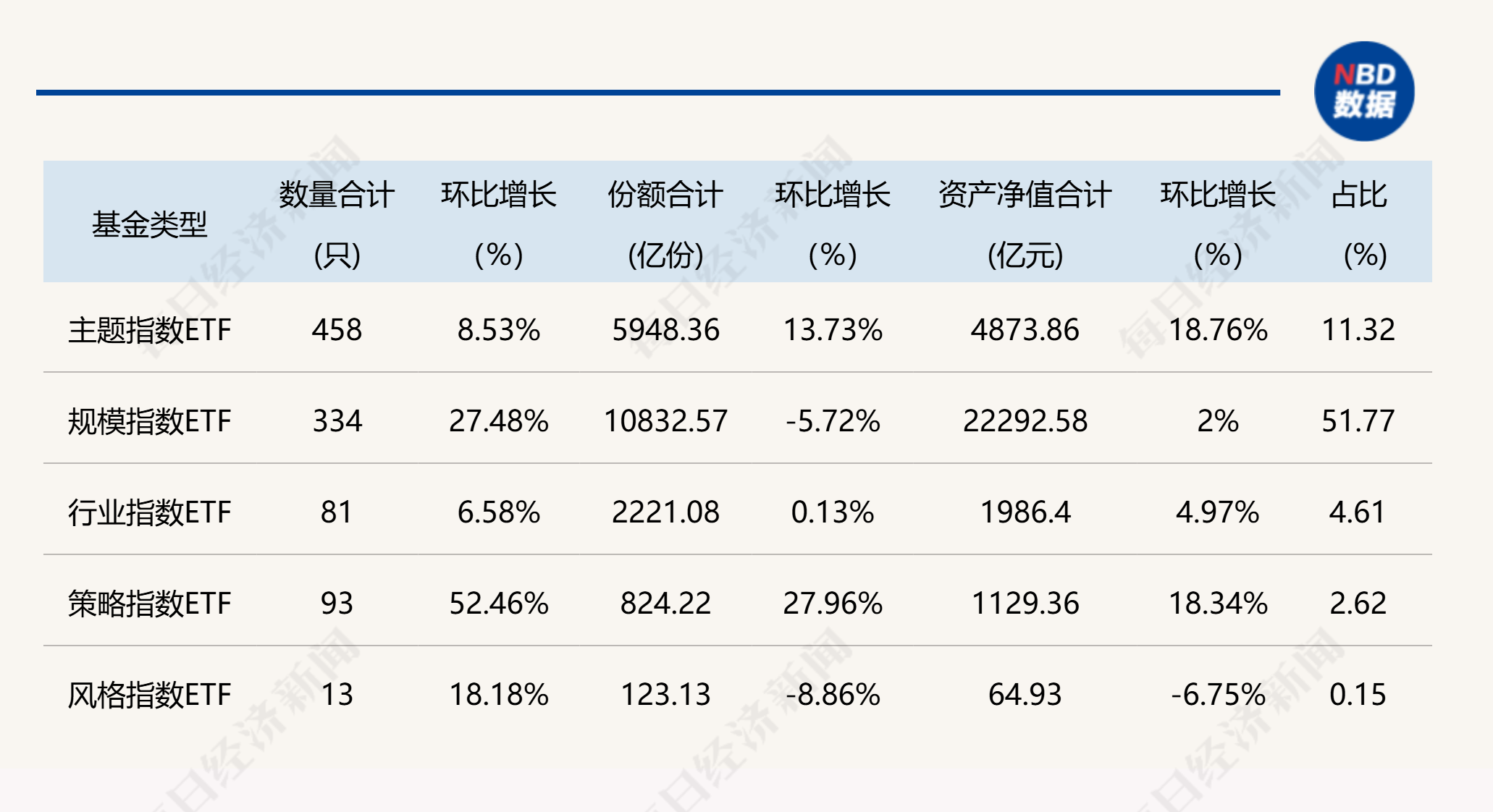 我们先来看看不同类型产品上半年的规模变动情况。首先是占大头的股票型ETF,上半年数量逼近1000只,相比去年年底新成立147只;规模已经突破3万亿大关,达到最新的3.03万亿元,环比增长5.09%。 相比之下,上半年规模增幅最大的是债券型ETF和商品型ETF,双双翻倍。其中,债券型ETF的最新规模为3839.76亿元,与去年年底的1739.73亿元相比增长了120.71%。富国中债7-10年政策性金融债ETF、海富通中证短融ETF等产品上半年都获得了资金的持续流入,前者最新规模已突破500亿元。此外还有多只债券型ETF规模超过百亿元,显示了上半年资金对于这类产品的偏好。 商品ETF上半年也表现亮眼,总规模从去年年底的756.73亿元增长至最新的1573.70亿元,增幅达到107.96%。而在这其中,黄金主题ETF“吸金”能力惊人,例如华安黄金ETF的规模就实现了翻倍,从去年年底的290亿元左右增加至最新的近600亿元;博时黄金ETF也从去年年底的150亿元左右激增至279.08亿元,此外还有多只黄金主题ETF规模已超百亿元。 另外,今年以来大量资金流入港股,相关主题ETF规模也出现猛增,带动跨境ETF总规模环比增长33.23%、达到5649.04亿元。其中,富国中证港股通互联网ETF的规模增长了超过250亿元,由去年年底的224.56亿元一举增加至最新的479.17亿元,直接翻倍。 受此影响,上半年跨境ETF、债券型ETF、商品型ETF的占比都有明显增加,分别由去年年底的11.38%、4.67%、2.03%提升至13.12%、8.92%和3.65%;与此同时,股票型ETF的占比则从去年年底的77.50%降低至70.47%,货币型ETF的规模占比也从4.22%下降至3.75%。 每经记者注意到,作为占据全市场ETF规模半壁江山的规模指数ETF,也就是宽基ETF,上半年的最新规模为2.23万亿元,环比增长2.00%,最新占比51.77%;相比之下,主题指数ETF和策略指数ETF上半年的规模增速比较快,最新规模分别为4873.86亿元和1129.36亿元,环比分别增长了18.76%和18.34%,行业指数ETF规模上半年也增长了4.97%至1986.40亿元;仅有风格指数ETF规模出现缩水。