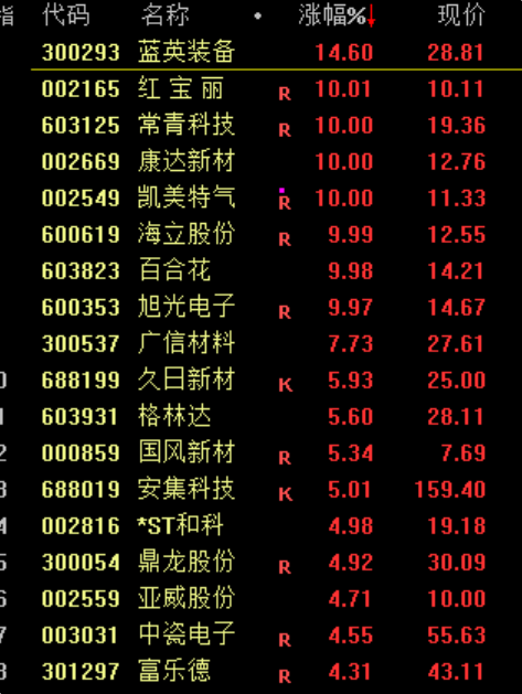 A股三大指数今日涨跌不一,截止收盘,沪指涨0.39%,收报3457.75点;深证成指涨0.11%,收报10476.29点;创业板指跌0.24%,收报2147.92点。沪深两市成交额达到14660亿,较昨日小幅缩量208亿。 ![]() 行业板块涨多跌少,玻璃玻纤、化学制药、生物制品、船舶制造、贵金属、电力行业涨幅居前,多元金融、软件开发、电池、计算机设备板块跌幅居前。个股方面,上涨股票数量超过2600只,逾70只股票涨停。芯片股一度冲高,凯美特气等10余股涨停。 创新药概念股再度爆发,昂利康、塞力医疗等多股涨停。 ![]() 光刻机概念板块延续强势,多股涨停。 ![]() 银行股展开反弹,建设银行、浦发银行等再创历史新高。 ![]() 军工股局部活跃,长城军工等涨停。 ![]() 下跌方面,稳定币概念股走低,吉大正元跌停。 ![]()