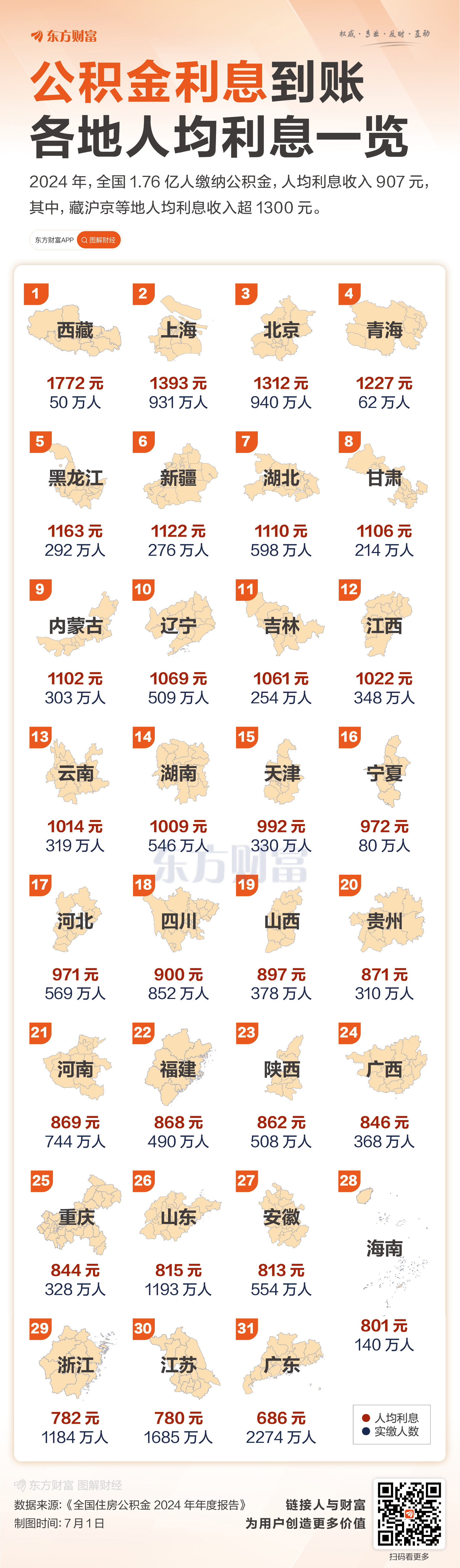 ![]() 7月1日,公积金年度结息到账,相关话题冲上热搜,大量网友参与讨论,并晒出自己的公积金年度结息账单。 据《全国住房公积金2024年年度报告》,2024年末,全国公积金缴存余额10.93万亿元,当年利息收入1597亿元,按全国1.76亿人缴纳公积金计算,人均利息收入907元。 分地区来看,2024年末,西藏公积金缴存余额591亿元,实缴人数为50万人。以此计算,西藏地区2024年的公积金人均利息收入达1772元,位列全国第一,接近全国均值的两倍。 上海、北京公积金人均利息位列全国第二、第三,均超1300元。数据显示,2024年末,上海公积金缴存余额8646亿元,实缴人数931万人;北京公积金缴存余额8222亿元,实缴人数940万人。以此计算,上海和北京2024年的公积金人均利息分别为1393元、1312元。 与大众印象不同的是,广东、江苏、浙江这三大经济强省,人均公积金利息排在全国倒数前三,且均低于800元。至于为何会出现这种情况,有分析人士指出,这几个地区经济相对发达,公积金缴纳覆盖面广,实缴人数居全国前列,但缴存比例相对较低。出于成本考虑,部分企业在为职工设定住房公积金缴存比例时一般会在5%~12%的区间内选取较低值。