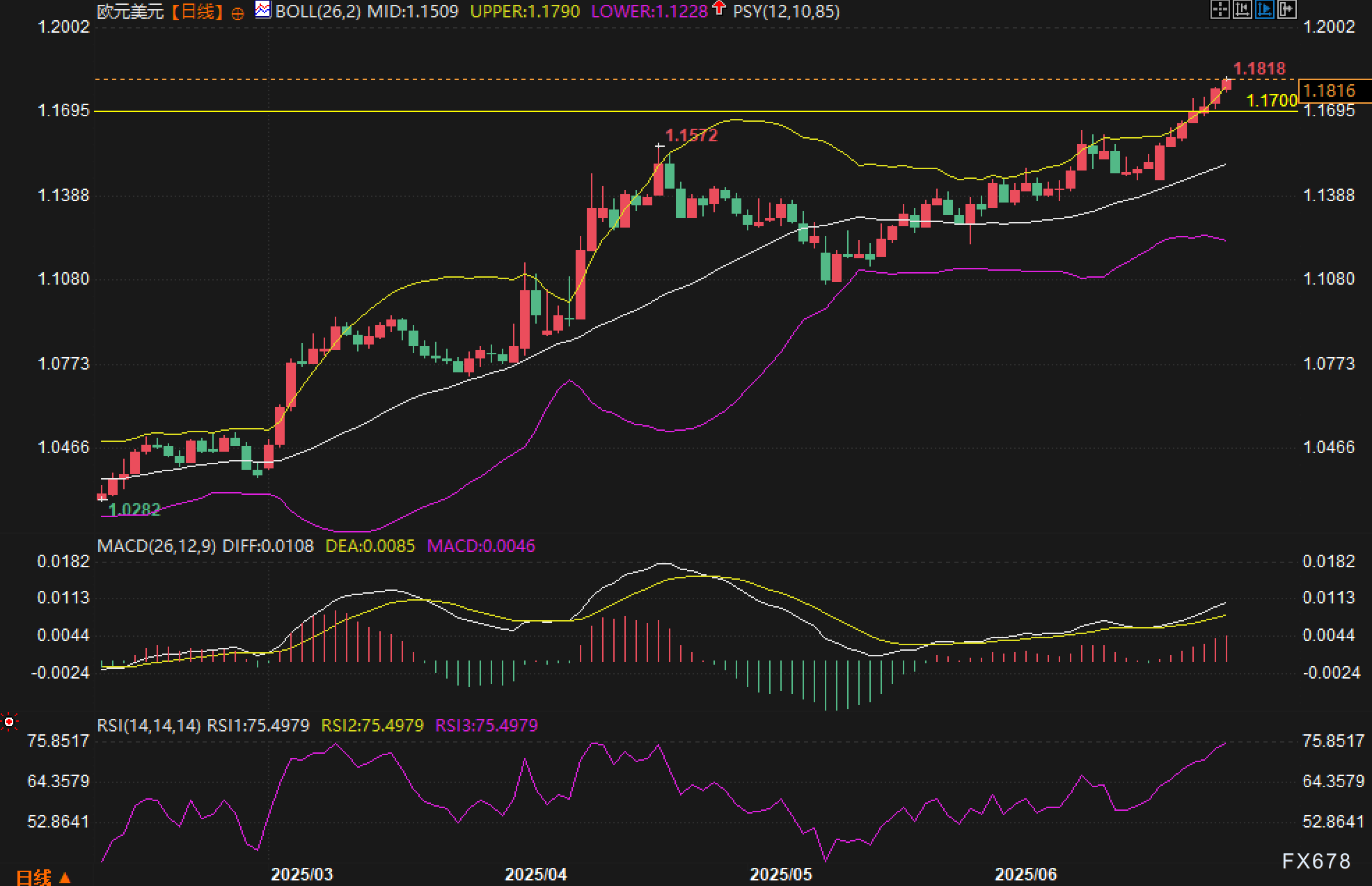 周二(7月1日),欧元/美元汇价盘中触及1.18上方,刷新近年新高。近期美元走弱背景下,欧元维持九连阳,强势上攻势头明显。市场关注焦点集中于欧洲央行(ECB)在葡萄牙辛特拉论坛的表态,以及今晚美联储主席鲍威尔在全球央行行长圆桌会议上的发言。 ![]() 欧元区6月HICP同比增长2.0%,略高于前值1.9%,符合市场预期,核心HICP亦维持在2.3%不变,显示通胀仍处于欧洲央行目标水平附近。服务业通胀略升至3.3%,能源通胀负值收窄至-2.7%。整体数据显示价格压力稳定,短期内并未显著加大。交易员当前更关注即将召开的辛特拉央行论坛,尤其是央行高层是否释放未来政策路径信号。 另一方面,美国宏观和政治不确定性持续施压美元。交易员担忧特朗普推动的税改将进一步恶化美国财政赤字,叠加对美联储干预倾向的担忧,使美元失去部分避险吸引力。同时,美联储年内降息两次的预期已被市场充分计价,CME利率期货显示9月降息概率接近100%。 技术面: 从K线图来看,欧元/美元连续九日阳,呈现典型的多头市场特征。价格突破前期高点1.1572后加速上涨,目前运行在布林带上轨之上,并无明显回调迹象。布林带整体开口向上,带宽扩大,表明当前波动率增加,趋势延续性增强。 ![]() 分析认为短期支撑位可关注1.1700附近;上方阻力位关注整数关口1.1900,若突破则技术上将打开进一步上行空间。整体来看,多头趋势结构明确,当前暂未见趋势性反转信号。 市场情绪观察 市场整体偏多情绪明显。从九个交易日连阳走势可见,多头资金持续流入欧元资产。交易员持续压注欧洲央行年内将谨慎行事,而美联储可能提前启动宽松周期的预期差形成明显交易逻辑。 不过分析认为需警惕市场短期出现“情绪过热”迹象。RSI进入超买区,日线级别走势脱离均线乖离过大,存在技术性回撤风险。此外,辛特拉论坛为潜在风险事件,若央行高层在通胀或政策表态上偏向鸽派,或引发交易员获利了结。 后市展望 短线来看分析认为,欧元/美元短期料维持高位震荡结构,市场静待央行论坛进一步指引。若欧洲央行维持现有立场,而美联储释放鸽派信号,汇价仍有望测试1.1900一线。不过,短线技术性回调风险亦不容忽视,特别是在晚间鲍威尔讲话前,部分资金或选择获利了结。 中期视角下,欧元前景仍取决于欧洲与美国政策利差演化。分析认为若欧元区经济恢复持续稳定,且联合债务等机制推进顺利,欧元资产吸引力将持续上升。同时,美元的“结构性信心问题”可能削弱其作为全球储备货币的优势。 ![]() |