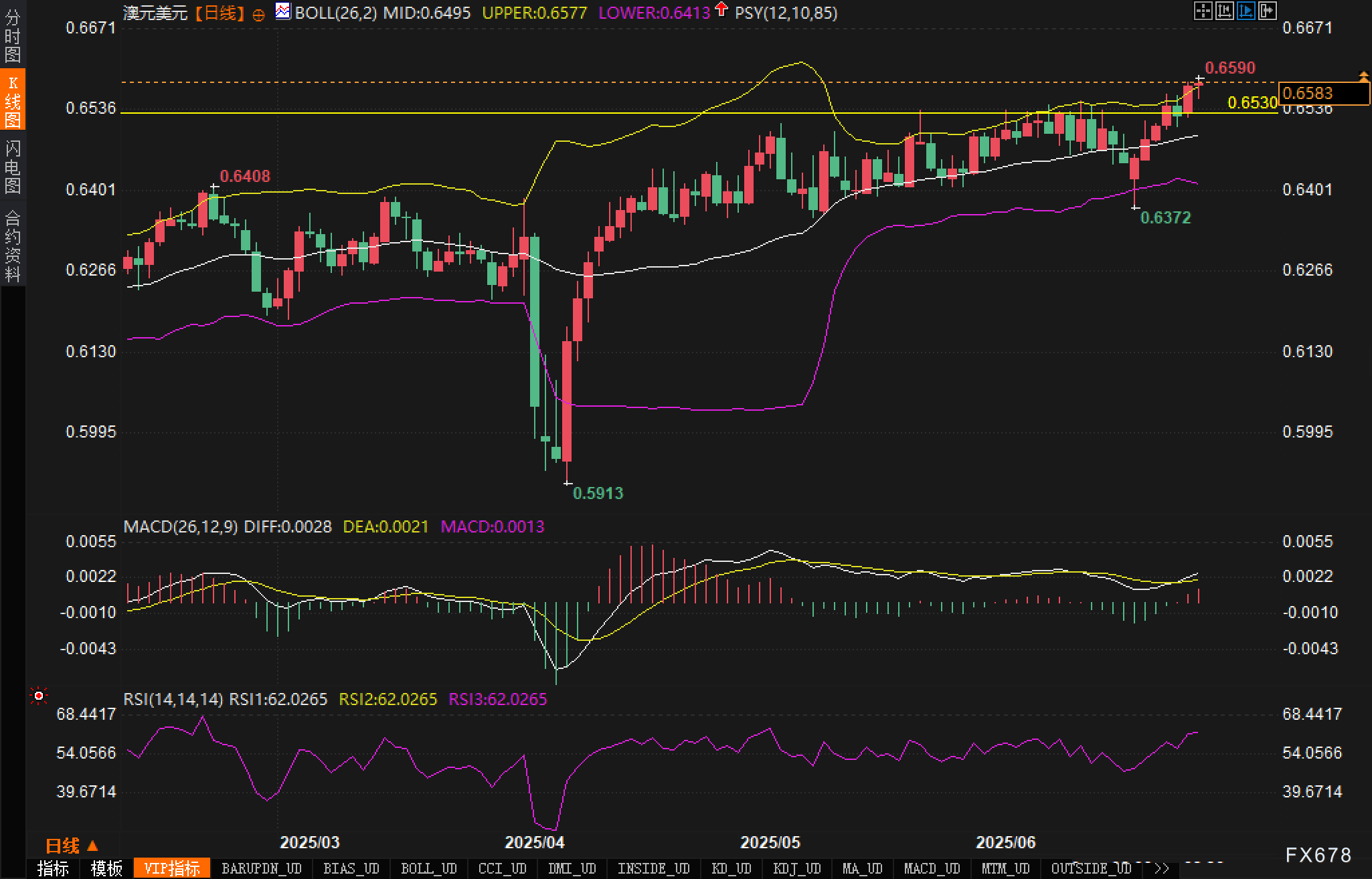 周二(7月1日),澳元兑美元延续上行走势,连续第二个交易日上涨,日内最高触及0.6590,刷新年内新高。受益于美元整体走软、澳洲关键贸易伙伴制造业数据改善,以及澳元本身的技术性突破,汇价稳步攀升。 ![]() 另一方面,澳元获得来自其主要出口对象国制造业复苏的间接支撑,推动市场情绪改善,利多澳元。此外,尽管澳大利亚政府预计未来出口收入将有所下滑,但出口量仍维持增长,部分抵消价格疲软的负面影响。 技术面: 从日线图来看,汇价在有效突破0.6530关键阻力位后加速上行,当前运行至布林带上轨附近,日内最高触及0.6590,标志着年内新高的确立;显示多头动能占优,短期趋势明确偏多。 ![]() 分析认为当前支撑位关注前期突破口0.6530,若守稳将为后续冲击0.6610-0.6660区间创造条件。若跌破该位,则需警惕短线回测中轨0.6495的可能。 市场情绪观察 当前市场情绪明显倾向多头。美元利空因素密集释放,交易员对美债风险、美国货币政策不确定性的担忧情绪高涨。 值得注意的是,分析认为尽管基本面利好和技术图形配合默契,但短期内快速上涨已将部分情绪推至极端,RSI临近超买区域,存在短线高位震荡的可能。晚间美联储主席鲍威尔在葡萄牙的讲话以及后续制造业与就业数据,可能成为短线方向选择的关键触发点。 后市展望 多头展望: 分析认为若晚间美联储言论进一步释放鸽派信号,或美国数据继续疲弱,将强化市场对年内降息的定价,美元压力不减,澳元有望挑战下一阻力位0.6610,若突破该位,下一目标或指向前期周线高点0.6660区域。 空头展望: 短期涨势较急,加之RSI逼近超买,分析认为若市场对美联储降息预期降温或晚间数据超预期好转,澳元可能出现高位震荡甚至回落。下方需关注0.6530支撑能否守稳,若跌破,或引发技术性回调,目标下看布林中轨0.6495及前低0.6370一线。 ![]() |