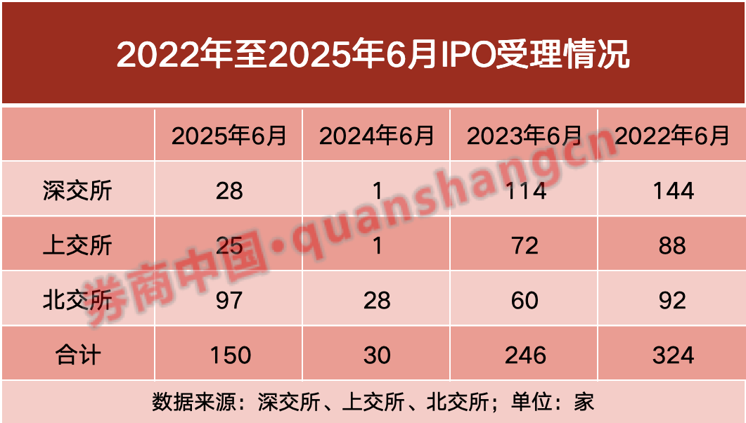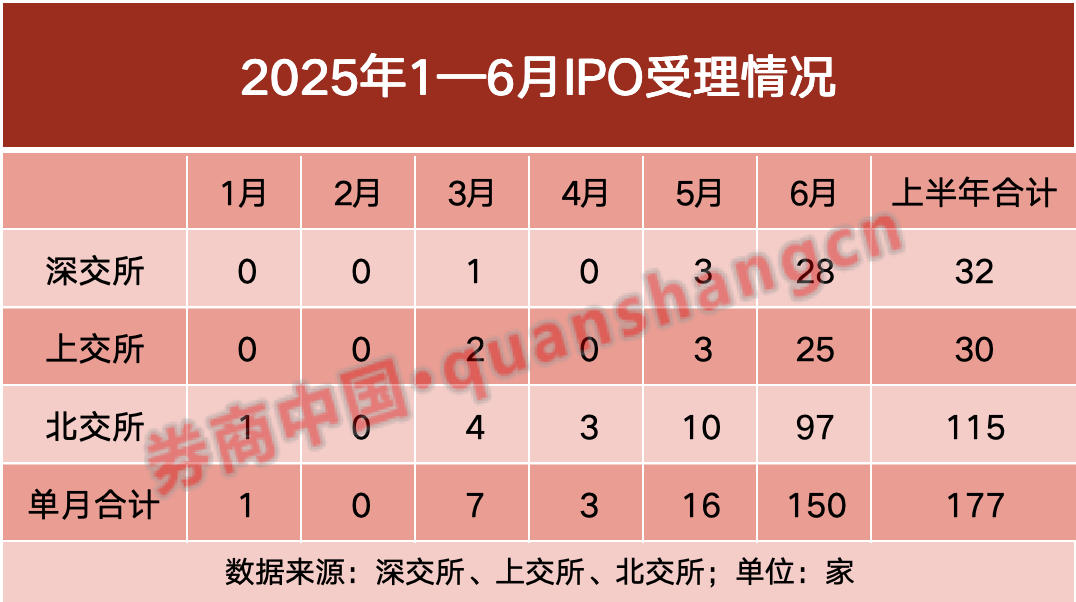 IPO上半年受理正式“收官”。 在年报财务数据有效期最后一日,6月30日沪深北交易所集中受理41家拟上市企业的IPO申请。 在今年6月这轮申报潮中,三地交易所单月新增受理企业总数达150家,是去年同期的5倍。不过受理家数增加并不意味着“大水漫灌”,该数据在2023年6月同期受理家数中占比60%。可以看出,市场在谨慎复苏中寻找新平衡。 这一轮申报潮恰逢关键政策窗口期。6月18日证监会主席吴清在陆家嘴论坛宣布“进一步全面深化资本市场改革开放,推动科技创新和产业创新融合发展迈上新台阶”并释放多项利好政策,比如重启未盈利企业适用科创板第五套标准上市,又如支持优质未盈利创新企业到创业板上市。记者注意到,6月创业板首次“破冰”,受理了首家未盈利企业IPO申请。 除未盈利企业外,其余企业盈利能力强劲是这轮申报潮中的一大看点。这在北交所与深市主板方面表现明显。根据券商中国记者统计,6月新受理的北交所IPO企业最新一年扣非净利润平均值已达到0.91亿元。 看点一:6月IPO受理家数回温 伴随上半年落下帷幕,6月IPO受理高峰结束。根据券商中国记者的统计,今年6月共有150家IPO获得受理,较去年同期(30家)实现数倍增长。 深圳一名券商投行人士表示,今年IPO受理情况有所恢复,但与往年相比仍然偏冷。根据记者统计,2022年6月、2023年6月分别有324家、246家IPO企业获得受理。上述券商投行人士认为,在当前“严把上市关”的基调下,沪深市场IPO受理“盛宴”难以回到过往。 ![]() 从上市板看,北交所受理IPO企业家数最多,已成为投行保荐的“首选地”。数据显示,6月北交所共受理97家,较去年同期增长逾200%。 值得注意的是,北交所今年6月的受理表现也好于过往多个年份。根据记者统计,2022年6月北交所受理92家;2023年6月为60家。 对此,深圳一名券商投行人士谈到,自IPO收缩以来,北交所更具包容性以及确定性,部分曾经想要冲刺沪深市场的IPO企业陆续“转道”北交所。 相较来看,在今年6月受理潮中,深交所和上交所各有28家、25家IPO企业获得受理,比去年同期有所回温,但与2023年相比(对应依次为114家、72家)仍有明显距离。 随着6月申报高峰结束,上半年IPO受理全景也已浮出水面。根据记者统计,上半年沪深北三地交易所共有177家IPO企业获得受理。其中北交所有115家,上交所与深交所分别为30家、32家。 ![]() 看点二:北交所盈利门槛悄然提升 在6月受理家数中独揽六成份额的北交所成为本次市场的关注焦点。其本轮受理企业盈利能力情况如何,为后续投行申报项目提供重要参考。 记者注意到,北交所新增受理的企业大多表现强劲的盈利能力。根据券商中国记者以6月北交所新受理的97家IPO企业作为样本观察,2024年扣非净利润平均值已达到0.91亿元。 其中,6月26日获得受理的乔路铭IPO项目为北交所本轮受理的“盈利王”。招股书显示,该企业2024年扣非净利润达到4.11亿元,已超过多家主板企业盈利水平。据悉,乔路铭是一家从事汽车饰件的研发、生产和销售的企业,主要产品包括汽车内饰件、汽车外饰件及配套模具。 另有4家新受理的北交所IPO企业2024年扣非净利润超过2亿元,分别为同富股份(2.33亿元)、金钛股份(2.27亿元)、南方乳业(2.07亿元)、欧伦电气(2.04亿元)。 在这轮6月受理潮中,也不乏利润规模相对较小但具有成长性的企业申报北交所。根据记者统计,有8家北交所IPO企业2024年扣非净利润低于5000万元。它们分别为嘉晨智能(4841.28万元)、金戈新材(4692.92万元)、提牛科技(4701.53万元)、中德科技(4571.62万元)、科金明(4470.49万元)、苏州双祺(4409.36万元)、尚研科技(4129.18万元)、传美讯(3914.02万元)。