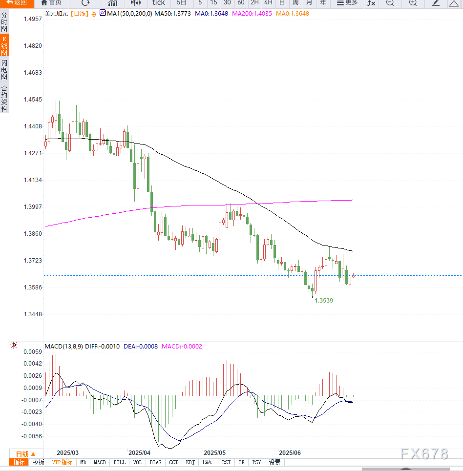 USD/CAD当前交投于1.3650附近,延续周二区间内走势,市场情绪明显谨慎。投资者普遍将目光投向即将于本周五公布的美国6月非农就业数据,以寻求美联储货币政策路径的进一步信号。 ![]() 美加贸易局势缓和有望支撑加元:白宫经济顾问哈塞特(Kevin Hassett)周一表示,对与加拿大重启贸易谈判持乐观态度,加拿大已撤销针对美国科技企业的数字服务税。这一举措缓解了美加之间的数字经济摩擦,并为加元提供了稳定基础。 美国对多边贸易政策态度仍存不确定性距离特朗普设定的7月9日关税最后期限仅剩几日,投资者普遍担忧美国对多个贸易伙伴的立场仍不明确。市场对特朗普税改政策的影响及其持续性也在观望之中。 加拿大经济基本面尚存韧性:尽管全球大宗商品价格波动,但加元受益于油价近期回稳,加上加拿大央行政策保持中性略偏鹰态度,使得汇价走势缺乏方向性突破。 日线图显示,美元/加元汇价持续受制于20日指数移动均线(EMA)上方,反弹乏力。每次上攻20日EMA(约1.3685)附近都遭遇抛压,显示市场偏好“Sell on Rise”(逢高做空)策略; 14日相对强弱指数(RSI)徘徊于40附近,若跌破该水平,将释放进一步看空信号;若跌破6月16日低点1.3540,将打开下探1.3500心理关口与1.3420(9月25日低点)的空间。 上行方面:首要压力为5月29日高点1.3820,若突破将进一步指向5月21日高点1.3920与5月15日1.4000整数关口。 ![]() 当前USD/CAD处于宏观事件“临界点”前的整理状态,既受到加元基本面支持,也受美元政策不确定性牵制。从走势结构看,若非农就业数据不及预期,将强化美联储降息预期,打压美元,并推动USD/CAD跌破1.3540,进入中期下行通道。反之,若数据意外强劲,短期反弹可能测试1.37-1.38区域,但受制于技术压力。 ![]() |