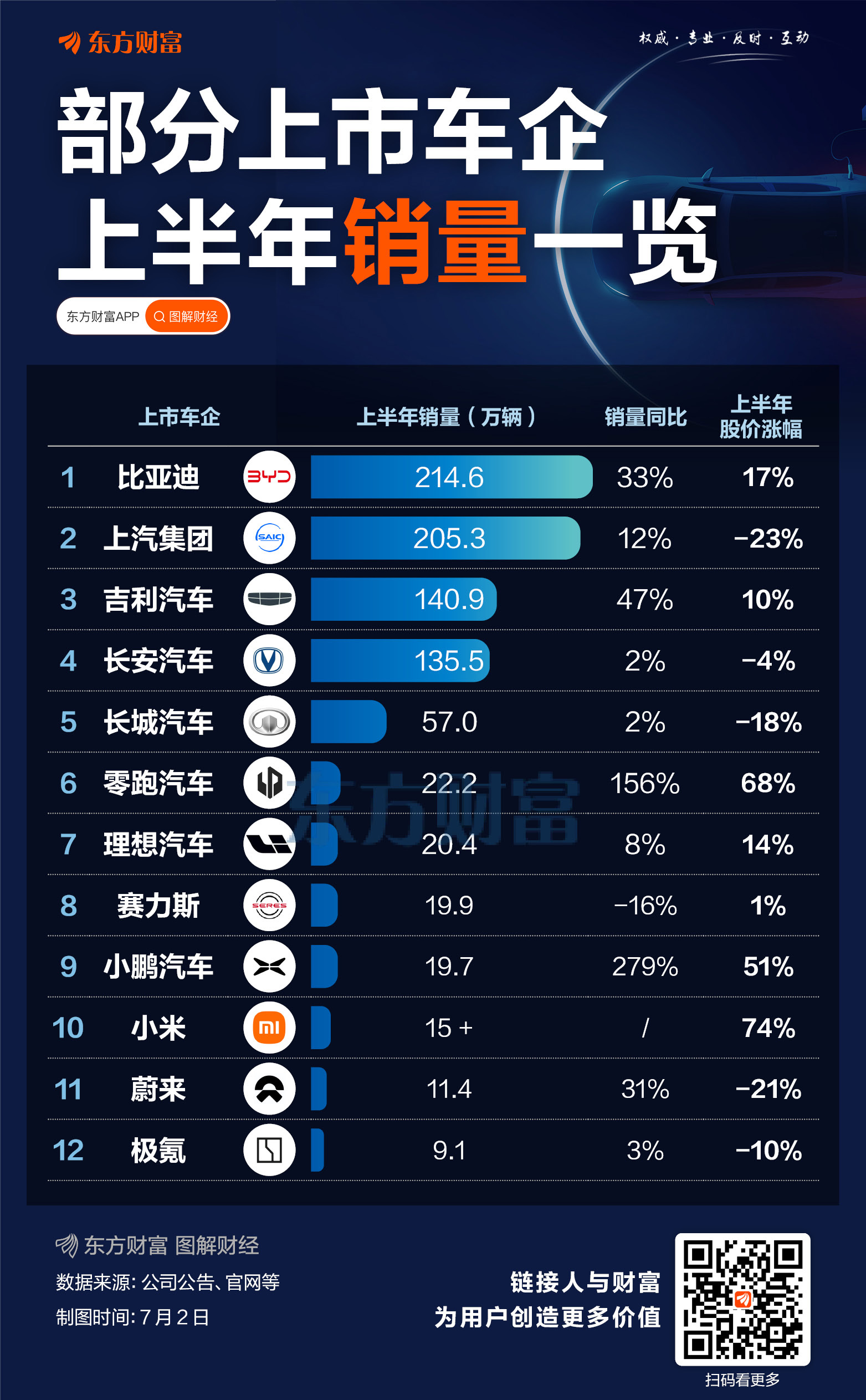 ![]() 截至7月2日,已有多家上市车企揭晓了今年6月及上半年的销售业绩,汽车市场格局再度引发关注。整体来看,大部分车企销量同比提升,部分新势力车企创下交付新高。 乘联会表示,年初时中国车企的市场表现受到春节假期的季节性影响,销量相对较低,但在以旧换新及报废更新的“双新”政策强力支撑下,二季度以来中国汽车市场恢复了强劲的增长势头。 乘联分会秘书长崔东树近日发文称,2025年中国乘用车市场将迎来量质齐升的“双增长”局面:全年零售销量预计达2405万辆,同比增长5%;新能源乘用车批发量有望突破1573万辆,同比增长近三成。 乘联会最新数据显示,新能源乘用车上半年累计批发销量647万辆,同比增长38%。 具体来看,上半年“老牌”车企中,比亚迪继续领跑,稳居中国车企销量第一位。产销快报显示,今年1—6月,比亚迪实现销量214.6万辆,同比增长33.04%。上汽集团紧随其后,上半年销量同样超过200万辆。产销快报显示,1-6月份上汽集团整车批售205.3万辆,同比增长12.4%。 新兴势力车企阵营中,零跑汽车以惊人的表现脱颖而出,6月交付量高达4.8万辆,刷新历史纪录。上半年,零跑汽车的总交付量达到了22.17万辆,同比暴涨156%。小鹏汽车今年上半年累计交付新车19.72万辆,同比暴涨279%,销量增速领跑所有上市车企。 “车圈网红”小米汽车则始终保持着比较好的发展节奏。1-6月,小米汽车累计交付量超过15万辆。据了解,小米汽车于2024年4月3日开启首批交付,同年11月18日达成10万辆交付目标,用时七个半月。目前,小米汽车旗下拥有多款在售车型,包括小米SU7、SU7 Ultra以及YU7。 至于市场关注度较高的广汽集团和江淮汽车,截至发稿尚未公布6月份的产销快报。资料显示,广汽集团旗下品牌包括广汽埃安、广汽丰田、广汽本田等,江淮汽车旗下品牌包括思皓、瑞丰等。值得一提的是,鸿蒙智行6月30日公布,其与江淮汽车合作打造的尊界S800旗舰轿车,上市首月大定突破6500辆。
