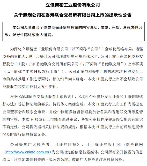 0立讯精密7月2日晚间公告,公司目前正在筹划境外发行股份(H股)并在香港联合交易所有限公司(以下简称“香港联交所”)上市事项(以下简称“本次H股发行上市”)。公司正在与相关中介机构就本次H股发行上市的具 ...