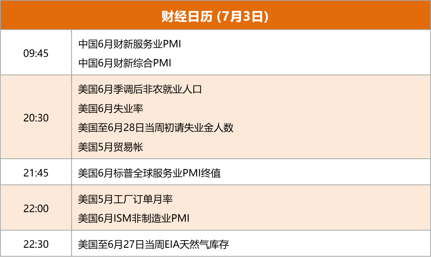 公司新闻立讯精密:公司目前正在筹划境外发行股份(H股)并在香港联合交易所有限公司上市事项。相关细节尚未确定,本次H股发行上市不会导致公司控股股东和实际控制人发生变化。待具体方案确定后,本次H股发行上市工作尚需提交公司董事会和股东会审议,并经中国证券监督管理委员会备案和香港联交所等监管机构审核。 贵州茅台:2025年6月,公司累计回购股份72000股,占公司总股本的比例为0.0057%,购买的最高价为1413.22元/股、最低价为1408.29元/股,支付的金额为1.02亿元。截至2025年6月底,公司已累计回购股份338.21万股,占公司总股本的比例为0.27%,购买的最高价为1639.99元/股、最低价为1408.29元/股,已支付总金额为52.02亿元(不含交易费用)。 富临精工:公司与川发龙蟒签署合作框架协议,双方将开展股权与资本合作,并共同投资设立合资公司,新建新型高压实密度磷酸铁锂正极材料项目与前驱体项目。 大中矿业:公司全资子公司金日晟矿业计划将周油坊铁矿的采选生产能力扩产至650万吨/年。金日晟矿业近日取得安徽省自然资源厅颁发的生产规模为650万吨/年、期限为30年的采矿许可证。 宗申动力:预计2025年上半年实现净利润4.79亿元—5.64亿元,同比增长70%—100%。报告期内,通用机械业务和摩托车发动机业务规模增长,投资联营企业收益提升,公司整体业绩实现同比增长。 蓝思科技:公司收到中信银行长沙分行出具的贷款承诺函,其将为公司提供不超过9亿元的贷款,专项用于支持公司回购股票。 人福医药:公司股东招商生科拟6个月内通过集中竞价、大宗交易等方式增持公司股份,累计增持比例不低于增持前公司已发行总股本的1%,不高于增持前公司已发行总股本的2%,增持价格上限为25.53元/股。资金来源为自有资金及股份增持专项贷款等。 宁德时代:截至6月30日,公司以集中竞价交易方式累计回购A股股份664.1万股,占公司当前A股总股本的0.1508%,最高成交价237.38元/股,最低成交价231.5元/股,成交总额15.51亿元(不含交易费用)。 点击查看更多上市公司重大公告>> 环球市场 交易提示![]() 点击立即参与申购>> 债市纵览Shibor:7月2日,隔夜shibor报1.3650%,下跌0.2个基点;7天shibor报1.4970%,下跌3.3个基点;3个月shibor报1.6195%,下跌0.85个基点。 欧债:当地时间7月2日,欧债收益率普遍上涨,英国10年期国债收益率涨15.8个基点报4.610%,法国10年期国债收益率涨7.2个基点报3.320%,德国10年期国债收益率涨8.5个基点报2.654%,意大利10年期国债收益率涨6.4个基点报3.511%,西班牙10年期国债收益率涨6.2个基点报3.274%。 美债:周三(7月2日)纽约尾盘,美国10年期基准国债收益率涨3.52个基点,报4.2769%,日内至北京时间14:00持稳于平盘附近,随后开始震荡上行,00:50涨至4.3063%刷新日高,之后逐步回吐涨跌幅。两年期美债收益率涨1.23个基点,报3.7848%,北京时间20:15发布美国ADP就业数据(小非农)时从日高3.7992%附近急剧跳水,转而跌至3.7437%刷新日低。 商品期货国内期货:7月2日,国内商品期货多数收涨,多晶硅涨停,涨幅7%,玻璃涨超6%,工业硅、氧化铝涨超4%,生猪、硅铁、焦煤、纯碱、碳酸锂、烧碱、焦炭涨超3%,螺纹钢、热卷、锰硅涨超2%。 国际黄金:COMEX黄金期货涨0.30%,报3359.70美元/盎司。 国际原油:纽约商品交易所8月交货的轻质原油期货价格上涨2.00美元,收于每桶67.45美元,涨幅为3.06%;9月交货的伦敦布伦特原油期货价格上涨2.00美元,收于每桶69.11美元,涨幅为2.98%。 国际金属:LME期铜收涨79美元,报10013美元/吨。LME期铝收涨22美元,报2620美元/吨。LME期锌收涨44美元,报2758美元/吨。LME期铅收涨22美元,报2060美元/吨。LME期镍收涨96美元,报15302美元/吨。LME期锡收涨53美元,报33714美元/吨。LME期钴收平,报33335美元/吨。 国际农产品:周三(7月2日)纽约尾盘,彭博谷物分类指数涨2.45%,报30.8208点,北京时间21:00美股开盘之前大致持平,随后持续上涨。CBOT玉米期货涨3.02%,报4.1825美元/蒲式耳。CBOT小麦期货涨2.91%,报5.65美元/蒲式耳。CBOT大豆期货涨2.00%,报10.4775美元/蒲式耳,豆粕期货涨1.08%,豆油期货涨2.59%。 外汇市场人民币:7月2日,在岸人民币北京时间16:30收报7.16700,较上一交易日跌52个点。离岸人民币北京时间18:00报7.16784,较上一交易日跌106.8个点。在岸/离岸人民币北京时间18:00价差为7.6点。 人民币外汇掉期:7月2日,截至北京时间16:30,美元兑人民币6个月掉期报-940.00点,美元兑人民币1年掉期报-1909.00点。 美元:美元指数2日下跌。衡量美元对六种主要货币的美元指数当天下跌0.05%,在汇市尾市收于96.777。截至纽约汇市尾市,1欧元兑换1.1800美元,高于前一交易日的1.1781美元;1英镑兑换1.3636美元,低于前一交易日的1.3738美元。1美元兑换143.62日元,低于前一交易日的143.72日元;1美元兑换0.7914瑞士法郎,低于前一交易日的0.7927瑞士法郎;1美元兑换1.3596加元,低于前一交易日的1.3652加元;1美元兑换9.5216瑞典克朗,高于前一交易日的9.4925瑞典克朗。 财经日历![]() |