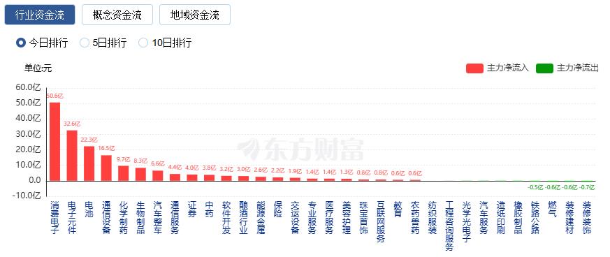 A股三大指数今日集体上涨,沪指再创年内新高。截止收盘,沪指涨0.18%,收报3461.15点;深证成指涨1.17%,收报10534.58点;创业板指涨1.90%,收报2164.09点。沪深两市成交额达到13098亿,较昨日缩量672亿。 ![]() 行业板块多数收涨,消费电子、生物制品、电子元件、化学制药、电池、中药板块涨幅居前,船舶制造、采掘行业跌幅居前。