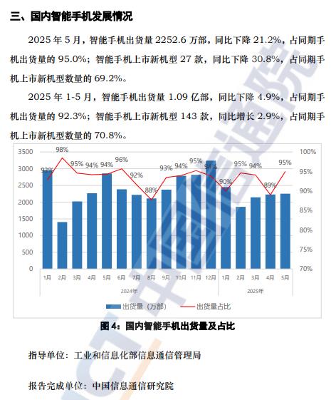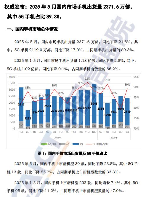 中国信通院:2025年5月,国内市场手机出货量2371.6万部,同比下降21.8%,其中,5G手机2119.0万部,同比下降17.0%,占同期手机出货量的89.3%。