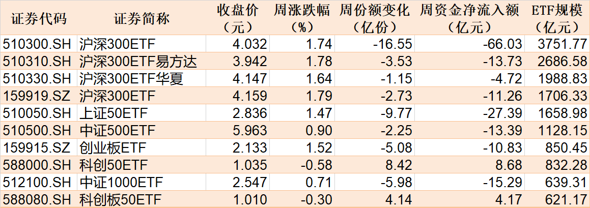 本周股指涨跌互现,沪深两市股票型ETF和跨境型ETF合计净流出逾百亿元。 行业主题上看,光伏、芯片等ETF被资金看好,而游戏、钢铁相关ETF被资金抛售。 逾百亿元资金借道ETF离场 本周沪深两市成交7.07万亿元,其中沪市成交2.73万亿元,深市成交4.34万亿元。截至最新收盘,沪指报收于3472.32点,全周上涨1.4%,深证成指报收于10508.76点,全周上涨1.25%。 ![]() 本周主要指数相关ETF表现 本周市场主要股指涨跌互现,规模较大的ETF中,沪深300ETF、上证50、创业板相关ETF涨超1%。 Wind数据显示,上述10只指数ETF本周合计净流出149.79亿元,其中沪深300ETF净流出66.03亿元。 总体而言,本周沪深两市股票型ETF和跨境型ETF合计净流出超百亿元。 有券商表示,进入7月,中报业绩预告逐渐披露,重点关注业绩超预期的个股机会。当前股市仍缺乏明确主线,前期因整体风险偏好抑制而出现波动的部分科技成长板块(半导体、人工智能、消费电子等)值得重点关注;新消费、创新药等成长性行业在短期调整后仍存在明确的向上逻辑;银行、公用事业等稳定板块在风险未完全释放的时间点仍具有配置价值。