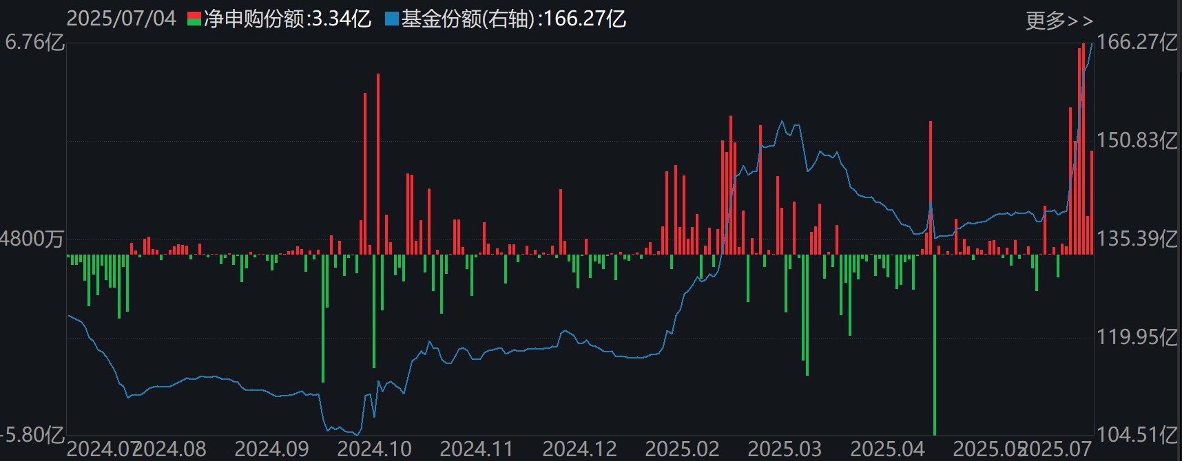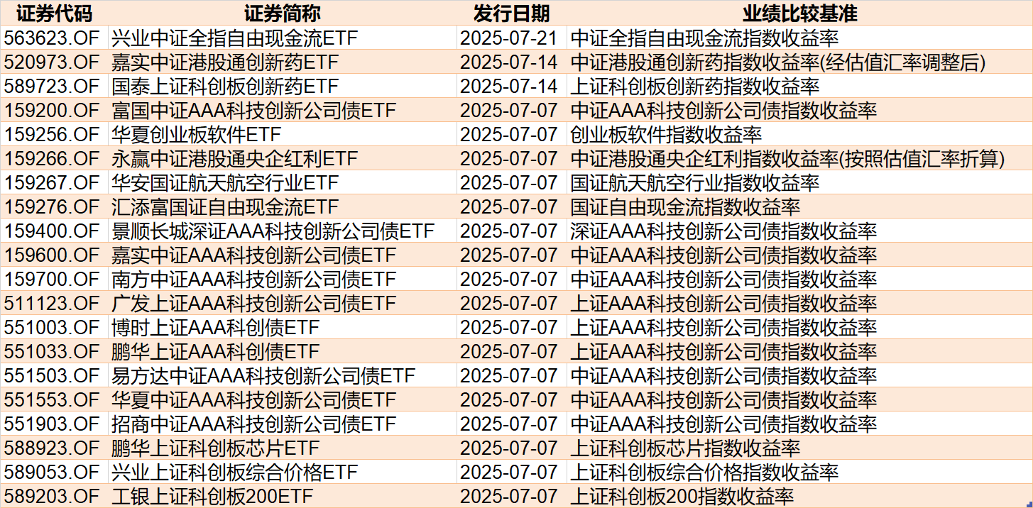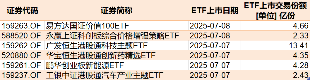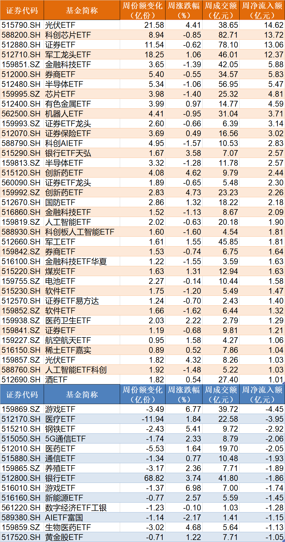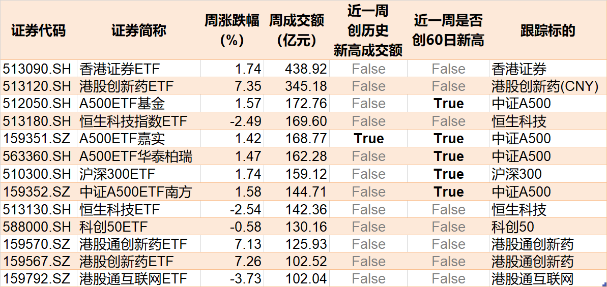 光伏、芯片、证券板块受资金追捧 在行业主题ETF方面,本周净流入资金超1亿元的基金有37只,其中光伏ETF、科创芯片ETF和证券ETF分别增加了21.58亿份、8.94亿份和11.54亿份,净流入资金14.62亿元、13.72亿元和13.06亿元。 ![]() 在资金流出方面,本周有14只行业主题ETF净流出逾1亿元,其中游戏ETF、医疗ETF和钢铁ETF份额分别减少3.49亿份、11.94亿份和2.43亿份,分别净流出资金4.45亿元、3.95亿元和2.92亿元。 值得注意的是,光伏ETF近期获资金大幅买入,份额突破166亿份,创历史新高。 ![]() 光伏ETF(515790)份额变化 消息面上,7月3日,工信部召开光伏行业制造业企业座谈会,会上提出“依法依规、综合治理光伏行业低价无序竞争,引导企业提升产品品质,推动落后产能有序退出,实现健康、可持续发展”,在宏观引导下,光伏行业有望迎来高质量发展机遇。 近期持续上涨的钢铁ETF遭到资金抛售,最新份额8.87亿份,相比5月下旬的16.89亿份,缩水近一半。 ![]() 钢铁ETF(515210)份额变化 有券商认为,钢铁行业在地产政策支持、基建投资稳中有增背景下,需求端边际改善,叠加供给端趋紧,板块配置价值凸显。 13只ETF周成交额超100亿元 本周,股票型ETF和跨境型ETF成交额超100亿元的ETF有13只。 ![]() 多只中证A500和沪深300相关ETF创出近60日新高。 成交额方面,香港证券ETF本周成交额超400亿元,港股创新药ETF本周成交额超300亿元。此外,A500ETF嘉实本周成交额168.77亿元,为上市以来最高周成交额。 有券商表示,美联储6月议息会议维持利率不变,但降息路径仍存不确定性,若释放明确降息信号将显著提振全球风险偏好。预计短期A股市场以稳步震荡上行为主,仍需密切关注政策面、资金面以及外盘的变化情况。 9只科创债ETF下周一发行 基金重仓股向来是投资者关注的热点,但是主动管理型基金的重仓股浮出水面,通常都有一定的滞后性,而ETF布局的标的却是非常明确的,通过跟踪新上市ETF,通常可以发现近期热点个股,新上市ETF带来的增量资金也值得关注。 目前有6只ETF披露下周上市,跟踪标的为港股通汽车、创业板新能源、港股通创新药等。 ![]() 目前有17只ETF披露下周一发行,其中9只跟踪标的为科创公司债指数。 ![]() (文章来源:每日经济新闻) |