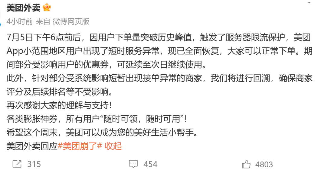 ![]() 7月5日晚间,阿里、美团上演了外卖大战! 外卖大战 7月5日晚间,泰勒不断从各大社交媒体看到消息,阿里、美团两大平台放出了大量且大额的外卖红包券。其中包括“满25减21”“满25减20”“满16减16”等多张无门槛的外卖券。 ![]() ![]() 甚至部分外卖还能“零元购”。 ![]() 至此,7月5日晚上的外卖大战正式开启。 泰勒亲自试了一下,一杯最常见的瑞幸美式咖啡,在红包券的加持下,美团、阿里平台购买仅分别需要2.2元和4.2元,且不需要配送费。 ![]() ![]() 一个肯德基的香辣鸡腿堡外卖价格仅需要不到10元,优惠20元。 ![]() 麦当劳一份双层鳕鱼汉堡套餐,平时需要超40元,7月5日晚间仅需要支付28元。 ![]() 随着优惠券的发放,不断有用户涌入阿里、美团两大平台下单,导致美团一度出现宕机。网友反映美团外卖点餐页面卡顿、优惠券使用异常,多次重试仍无法下单。 对此,美团方面回应称,7月5日下午6点前后,因用户下单量突破历史峰值,触发了服务器限流保护,美团App小范围地区用户出现了短时服务异常,现已全面恢复,大家可以正常下单。在此期间部分受影响用户的优惠券,可延续至次日继续使用。此外,针对部分受系统影响短暂出现接单异常的商家,“我们将进行回溯,确保商家评分及后续排名等不受影响”。 ![]() 美团内网公布的信息显示,截至7月5日22时54分,美团即时零售当日订单已经突破了1.2亿单,其中餐饮订单已超过1亿单。当晚20时45分,美团内网曾显示即时零售日订单突破了1亿单。 ![]()