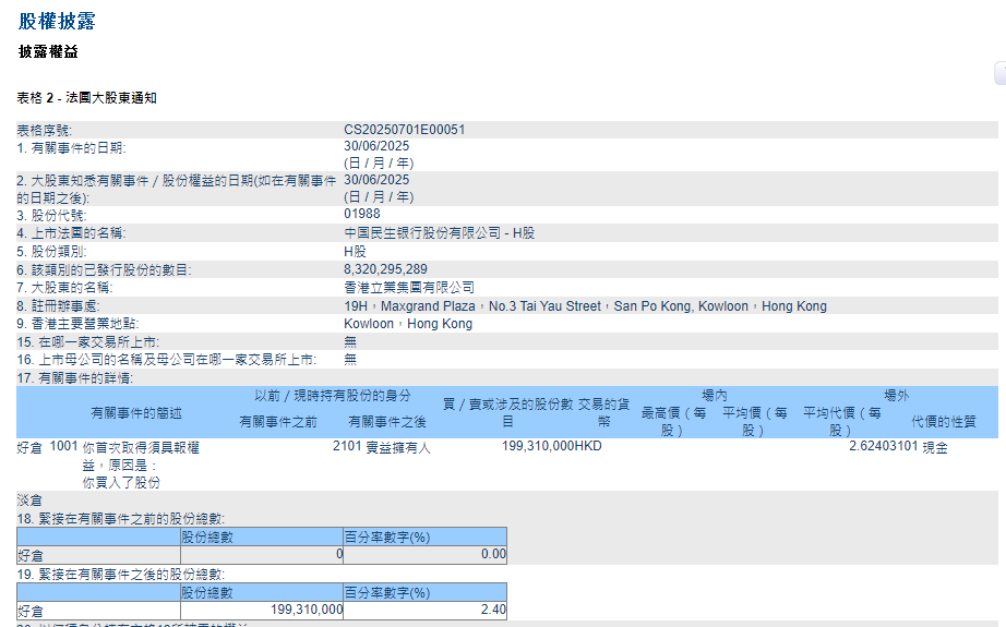持股比例达4.945% 香港交易所数据显示,6月30日,香港立业通过场外交易以每股2.62港元的均价购入民生银行H股1.99亿股,对民生银行H股的持股比例升至2.4%。 ![]() 来源:港交所网站 香港立业作为立业集团旗下企业,据中国证券报记者测算,此次交易后,立业集团及其一致行动人对民生银行A+H股的总持股达21.66亿股,占民生银行总股本4.945%,距离5%的举牌门槛仅一步之遥。 立业集团官网显示,该集团创建于1995年,是一家综合产业控股集团,主要涉及电力设备制造、新能源、化工、生物医药、金融服务等领域。目前集团控、参股子公司已超百家,旗下拥有华林证券、立业电力、立业电子、立业制药、精进能源等企业。 股东结构生变 根据民生银行公告,立业集团在2023年三季报时以3.37%的持股比例首次进入前十大股东行列,位列第七位。经过持续增持,至2024年一季报,立业集团持股比例已提升至4.49%,股东排名跃升至第四位。 ![]() 来源:民生银行2023年三季报 ![]() 来源:民生银行2024年一季报 民生银行2025年一季报显示,目前,民生银行前三大股东分别为香港中央结算(代理人)有限公司、大家人寿保险股份有限公司—万能产品、大家人寿保险股份有限公司—传统产品。 ![]() 来源:民生银行2025年一季报 值得关注的是原大股东泛海集团的持股变化。该集团在2023年三季报时以4.12%的持股比例位居民生银行第六大股东,但民生银行副行长黄红日今年4月在业绩发布会上透露,根据中国证券登记结算有限责任公司提供的股东名册,泛海集团仅持有1股该行股票,已不再是该行主要股东。 与此同时,黄红日表示,2024年末泛海系在民生银行贷款余额为184.84亿元。泛海系贷款的主要担保物为武汉地区土地抵押、武汉中心大厦在建工程抵押、部分商业房地产抵押及部分股权质押等,该行综合客户风险状况及抵质押担保情况等因素进行拨备计提。 (文章来源:中国证券报) |