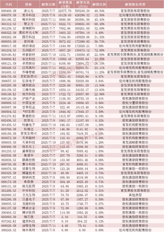 数据显示,下周A股市场将有51只股票面临解禁,合计解禁数量为13.84亿股,按最新收盘价计算,合计解禁市值为377.67亿元,周环比减少55.81%。 从解禁股情况来看,凌云光、昊华科技、唯科科技、智立方、普瑞眼科将解禁市值均超30亿元,五洲医疗、智立方、思科瑞、普瑞眼科流通盘均将增加超100%。 2只股票将解禁市值超40亿元 在下周面临解禁的51只股票中,从解禁市值情况来看,数据显示,按最新收盘价计算,凌云光、昊华科技、唯科科技解禁市值居前,解禁市值分别为59.52亿元、42.63亿元、36.36亿元。 具体来看,数据显示,凌云光7月7日将解禁2.24亿股,均为首发原股东限售股份。昊华科技7月8日将解禁1.61亿股,均为定向增发机构配售股份。唯科科技7月11日将解禁5690万股,均为首发原股东限售股份。 从市场表现来看,数据显示,截至7月5日,下周解禁市值居前的凌云光、昊华科技、唯科科技7月以来分别下跌3.52%、2.36%、5.57%。 下周解禁市值前十股票 ![]() 在下周面临解禁的51只股票中,解禁市值最大的凌云光解禁股东为姚毅、杨艺,分别为凌云光第一、第二大股东。二人为夫妻关系,是凌云光实际控制人。 数据显示,截至7月4日收盘,凌云光股价为26.60元/股,市值为123亿元。上市以来,凌云光后复权股价相较发行价累计涨逾20%。