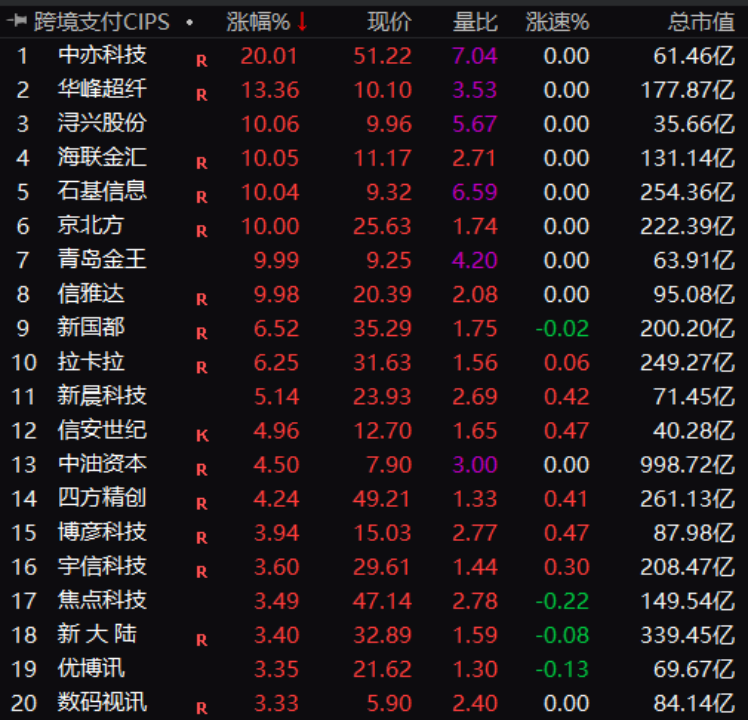 集体飙升 从盘面上看,稳定币和跨境支付已经走出持续性,赚钱效应也在显现。截至午盘,中亦科技拿下20cm涨停,华峰超纤涨超13%,浔兴股份、海联金汇、石基信息、京北方、青岛金王、信雅达等涨停,新国都、拉卡拉、新晨科技、信安世纪等涨幅居前。 ![]() 港股方面,国泰君安国际大涨超6%,弘业期货、申万宏源香港、兴证国际等涨幅居前,板块涨幅一度超2%。港股稳定币概念股全线上涨,板块涨幅亦超2%。众安在线大涨超5%,连连数字大涨近4%,渣打集团、中国光大控股、OSL集团涨幅皆超2%。 政策面上,为适应人民币跨境支付系统(CIPS)业务发展需要,中国人民银行也修订了《人民币跨境支付系统业务规则》,形成《人民币跨境支付系统业务规则(征求意见稿)》,现公开征求意见。《业务规则》明确了CIPS参与者的账户管理、注资、资金结算等详细流程。随着CIPS功能和服务的持续优化,有必要调整《业务规则》相关内容,仅对参与者业务行为提出原则性要求,确保规范性文件的前瞻性和科学性,有效适应CIPS业务发展和功能升级的需要。 国元证券在研报中建议,关注稳定币生态建设相关厂商,尤其是具备金融科技基础的上市公司。 中航证券表示,香港《数字资产政策宣言2.0》同步推进,鼓励稳定币在跨境支付、旅游门票RWA化等场景落地,为中资科技企业探索离岸人民币稳定币试点提供政策支持。稳定币具备低手续费、可编程、可审计等优势,有望重塑跨境支付与链上清结算模式,成为连接资产与支付的数字基础设施。RWA资产链上化趋势加快,跨境支付场景成焦点,2024年全球跨境支付交易额达194.6万亿美元,预计2032年将达320万亿美元。 (文章来源:券商中国) |