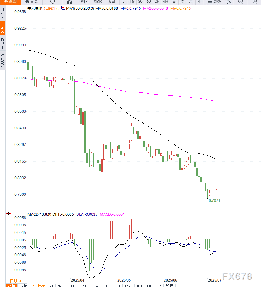 市场关注美方贸易谈判进展,瑞郎走势谨慎 ![]() 美国美元指数(DXY)略升至97.15,但升幅温和,因市场对美联储政策路径存疑。美方虽加速推进双边贸易协议签署,但新的关税执行日(8月1日)并非最终截止点,而是为谈判留出再调整时间的标志性节点。 瑞士通胀略超预期,SNB仍倾向负利率 瑞士6月CPI同比上升0.1%,高于市场预期的-0.1%,但涨幅温和,尚不足以促使瑞士央行转向鹰派。市场普遍预计,SNB将继续维持政策弹性,并在必要时维持或重启负利率,以防止瑞郎过度升值对出口经济造成打击。 从技术角度来看,USD/CHF维持在0.7940–0.7960区间震荡,短期均线略向下倾斜,MACD指标横盘整理,显示动能不足。若突破0.7975区域,可能测试0.8000整数关口,进一步上行将面临0.8030阻力位。 下行方面,若跌破0.7920支撑位,则下一个目标看向0.7885区域,即6月低点附近,进一步则指向0.7850水平。 “当前USD/CHF走势更多受避险逻辑与政策预期双重主导,短期方向仍待美方关税决策落地。”——市场调查显示 ![]() 短期来看,USD/CHF将在贸易政策与避险情绪之间寻求平衡。若美国加征关税的范围扩大且谈判破裂,瑞郎可能因避险情绪获得短暂支撑;但若瑞士央行表态维持负利率宽松基调,则可能削弱瑞郎的中期升值空间。 ![]() |