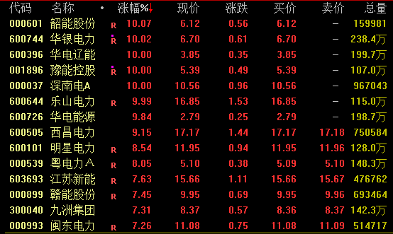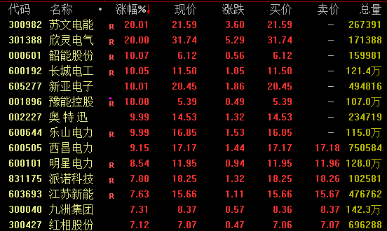高温概念股集体爆发。 7月7日,沪指盘中窄幅震荡,深证成指、创业板指弱势下探;港股尾盘止跌回升,恒生科技指数翻红,茶饮等消费股表现亮眼。 具体来看,沪指盘中维持窄幅震荡走势,创业板指跌超1%。截至收盘,沪指微涨0.02%报3473.13点,深证成指跌0.7%报10435.51点,创业板指跌1.21%报2130.19点,北证50指数跌近1%;沪深北三市合计成交12272亿元,较前一交易日减少近2300亿元。 场内超3200股飘红,电力板块爆发,韶能股份连续两日涨停,华银电力近5日斩获4板,乐山电力等涨停;充电桩概念拉升,苏文电能、欣灵电气等涨停;地产板块走高,渝开发、沙河股份等涨停;跨境支付概念强势,中亦科技20%涨停,信雅达连续两日涨停;体育概念活跃,共创草坪、双象股份涨停。创新药概念回落,科兴制药跌超14%。 港股方面,截至发稿,百果园集团涨近14%,茶百道涨超11%,古茗、蜜雪集团、沪上阿姨等涨超5%。 电力板块爆发 电力板块盘中大幅走高,截至收盘,韶能股份涨停斩获两连板;华银电力再度涨停,近5个交易日斩获4板;华电辽能、豫能控股、深南电A、乐山电力等亦涨停。 ![]() 消息面上,高温席卷全国,迎峰度夏电力负荷持续攀升。据国家能源局数据,7月4日,全国最大电力负荷达到14.65亿千瓦,较6月底上升约2亿千瓦,创历史新高,较去年同期增长接近1.5亿千瓦。入夏以来,江苏、安徽、山东、河南、湖北等地电网负荷创历史新高。据南方电网预测,今年迎峰度夏期间,南方电网最高电力负荷将达到2.7亿千瓦。据中国气象局预测,7月4日至10日,黄淮、江汉、江南等地将出现持续性高温天气,部分地区达到或超过历史同期极值,预计华东、华中地区电力负荷还将不断攀升,带动全国电力负荷持续增长。机构表示,迎峰度夏拉动电力需求,叠加业绩期催化,建议重视电力板块配置。 湘财证券表示,预计在持续高温影响下,短期电网负荷将维持高位,推动电力供需格局改善。全国统一电力市场建设加速推进下,持续看好电力资产价值重估。推荐关注三条主线:基本面稳健、长期有望受益统一电力市场建设的水电标的;成本下行情况下业绩有望改善且资产所在区域供需格局好的火电标的;绿电存量项目盈利平稳过渡推动板块估值修复,在全面入市开启背景下看好运营能力强的龙头企业和资源区位优质的标的。 充电桩概念崛起 充电桩概念午后快速走高,截至收盘,苏文电能、欣灵电气、长城电工、奥特迅等涨停,江苏新能涨超7%。 ![]() 消息面上,7日,国家发展改革委办公厅等发布关于促进大功率充电设施科学规划建设的通知,其中提出,到2027年底,力争全国范围内大功率充电设施超过10万台,服务品质和技术应用实现迭代升级。 通知指出,发挥政府引导作用,推动要素资源集约化利用,支持具有良好投资能力和运营经验的优质运营商开展场站建设、改造和运营。积极布局公交、物流、中重型货运等专用大功率充电设施。新能源汽车企业自建的大功率充电设施网络,原则上应无差别开放。结合场站条件推广充电站与餐饮、娱乐、购物、汽车服务等融合的商业模式,提升充电服务体验。各地牵头负责充电设施发展的部门要会同相关部门进一步加强大功率充电设施发展要素保障,加大用地、供电、财政、金融等配套政策供给。鼓励给予充电场站10年以上租赁期限,引导企业长期稳定经营。电网企业应加强大功率充电设施的用电保障,重点解决高速公路服务区的用电容量,降低电力引入成本,缩短电力扩容周期。鼓励研究大功率充电设施建设运营补贴激励机制,通过地方政府专项债券等支持符合条件的大功率充电设施项目建设。