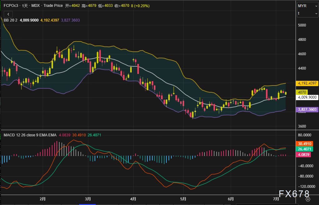 马来西亚棕榈油期货周一 7月7日 逆势收涨 尽管亚洲交易时段早盘受豆油拖累一度承压 但原油价格反弹最终带动市场情绪回暖 截至收盘 BursaMalaysia交易所主力9月合约FCPOc3报4070林吉特 吨 微涨8林吉特 0 2 日 ...