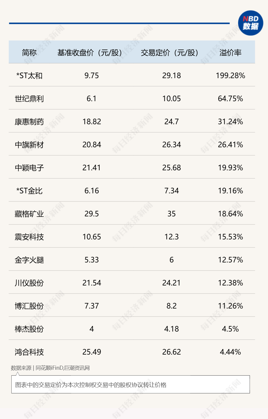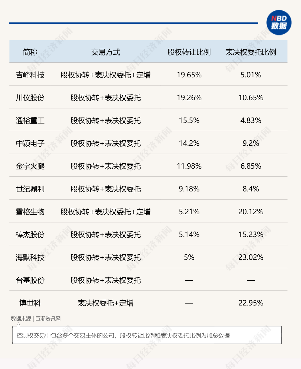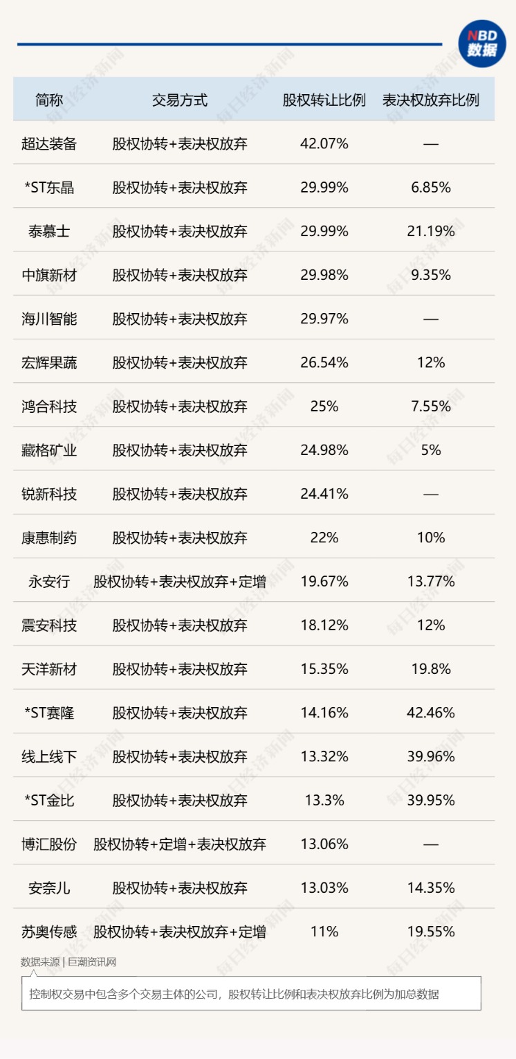 表决权放弃和委托如何搭配更“香”?五大方面是关键 那么,上述31家上市公司的控制权交易案例中,具体是如何使用表决权放弃和表决权委托来实现控制权变更的呢?每经资本眼研究员经进一步梳理,发现大多数公司会选取其中一种,搭配股权协议转让或定增等方式进行控制权交易。 上述31家公司中,选择表决权放弃的共有19家,其中,藏格矿业、鸿合科技等16家公司交易方式为股权协议转让+表决权放弃;永安行、苏奥传感和博汇股份3家为股权协议转让+表决权放弃+定增。 ![]() 而选择表决权委托的有11家,其中,川仪股份、通裕重工等8家公司交易方式为股权协议转让+表决权委托;吉峰科技和雪榕生物2家为股权协议转让+表决权委托+定增,博世科为表决权委托+定增。 ![]() 另外,*ST太和这家公司的交易方式为:股权协议转让+表决权委托及表决权放弃,是31家公司中唯一一家表决权放弃和委托混合使用的案例。 同时,通过上述图表数据计算,每经资本眼研究员发现,两种表决权安排方式在股权转让比例和表决权放弃/委托的比例方面有较明显差异。 首先是包含表决权放弃的19家公司,转让方股权转让比例平均值约21.89%;承诺的剩余所持股份对应的表决权放弃比例平均约18.25%(有4家目前未披露具体放弃比例,剔除后计算)。其中*ST塞隆实际控制人表决权放弃比例高达42.46%,线上线下实际控制人及一致行动人表决权放弃比例39.96%,*ST金比实际控制人表决权放弃比例39.95%,都属于大比例表决权放弃的典型案例。 其次是包含表决权委托的11家公司,剔除无数据的两家公司,其余9家公司的转让方,股权转让比例平均值约11.68%;承诺的剩余所持股份对应的表决权委托比例平均值约11.48%。其中海默科技控股股东、实际控制人等三方表决权委托比例最高,达到23.02%;且股权转让比例仅5%,又是这些公司中最低的,可以说是“小比例协转+大比例表决权委托”模式的典型代表。 通过数据对比来看,表决权放弃的案例中,股权转让比例平均值(21.89%)和表决权放弃比例平均值(18.25%),都明显高于表决权委托案例中对应的平均值(分别为:11.68%和11.48%)。那么,两者之间的数据差异是如何造成的?上市公司控制权交易中,交易双方考虑使用表决权放弃或委托的影响因素主要有哪些?民生证券投行事业部保荐代表人吴超向每经资本眼研究员表示: 一是限售法规的限制。《公司法》对于董监高限售有明确规定,如果上市公司实控人是个人直接持股且担任董监高职务,每年转让股份不能超过其所持有公司股份总数的25%。所以他只能转让其中一部分股权,必要时就需要借助表决权放弃或委托来调节,以便收购方能够提前获得上市公司的控制权。这种情况比较多一点。 二是要约收购法规的限制。如果交易双方一次性转让股权比例超过30%,有可能触及要约收购。 三是资金成本问题,表决权放弃和委托通常是无对价的,收购方如果资金有限,或者愿意支付的资金总额偏低,可以借这种方式,以较低成本取得和增强其控制权。 米度资本并购合伙人赵笛在采访中也提到了上述第一点董监高相关限制因素,同时补充了另外两点: 一是对于有些上市公司控股股东持股比例很高的情况,有可能转让老股后,新控股股东持股比例还会低于原控股股东的持股比例,这种情况下,交易所会非常关注实控人地位是否稳定,所以在交易协议中必须约定表决权委托或放弃,且多数是要实现不可撤销的情况。 二是原控股股东将投票权委托给新控股股东后,相当于是构成了一致行动人,会对原控股股东后续减持构成影响,这个也需要斟酌。 近期控制权交易价格较去年有所上涨,棒杰股份收购方不足1亿拟拿下控制权 如上所述,通过表决权放弃或委托,可以助力收购方以较低的资金成本取得上市公司控制权。那么,目前A股控制权交易价格整体处于什么水平区间呢? 赵笛表示,整体来看,目前A股控制权交易的价格集中在三个区间:一是ST公司或者有保壳压力的公司,取得控制权的价格一般在3亿元左右,对应交易市值在15亿~20亿元;二是没有保壳压力,但也无太多潜力的上市公司,取得控制权的价格一般在6亿元左右,对应交易市值在30亿~35亿元;三是上市公司账上现金充裕,有利于后续资本运作的上市公司,取得控制权的价格一般在10亿元左右,主要是考虑了上市公司可用资金部分,对应交易市值在50亿元左右。 同时赵笛又补充道,近段时间,由于控制权交易活跃,以及小盘股股价上涨较多,导致控制权交易价格较去年已经有一定的上涨。 每经资本眼研究员对上述31家公司的交易价格进行了统计和粗略计算: ![]() 其中,交易总额在5亿元以下的有10家,4家属于*ST公司;其交易价款平均值约3.45亿元,以各家公司首次披露日市值数据为准(下同),市值平均值约30亿元。 交易总额在5亿~10亿元区间的有11家,其交易价款平均值约7.3亿元,市值平均值约33亿元。 交易总额在10亿元以上的有9家,其中藏格矿业本次控制权交易价格高达137亿元,又是上述31家公司中总市值最高的,约466亿元,属于上市公司控制权交易中较为少见的高市值收购案例,与其他公司可比性较小,因此这里剔除计算。其余8家公司的交易价款平均值约15亿元,市值平均值约65亿元。 从统计情况看,上述31家公司的交易价格水平基本在A股整体交易价格区间波动,略有上浮。而藏格矿业这一案例的出现,与“并购六条”提出的“鼓励引导头