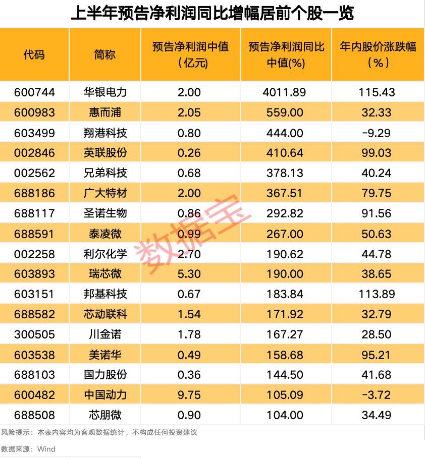 78股发布上半年业绩预告 据证券时报·数据宝统计,昨日晚间还有燕京啤酒、光迅科技、华友钴业等20余家公司发布了上半年业绩预告相关数据。截至目前,A股中有78家上市公司已经发布了上半年业绩预告,其中58股业绩预喜(包含预增、略增、续盈,扭亏)。 按照预告净利润中值来看,工业富联、立讯精密、新和成、华友钴业、中策橡胶、三花智控的净利润规模居前,均超20亿元。 立讯精密的净利润仅次于工业富联,公司预计略增,预测净利润约64.75亿元至67.45亿元,同比增长约20%至25%。 华友钴业预计2025年上半年归母净利润盈利26亿元至28亿元,同比增长55.62%至67.59%。公司业绩增长主要受益于公司产业一体化经营优势的持续释放、钴价的回升、公司管理变革、降本增效的深入推进。 ![]() 从净利润预增幅度中值来看,华银电力的净利润同比增幅最高。公司在近日披露的股价异常波动公告中表示,受发电量增加和燃料成本下降等因素影响,预计公司2025年半年度实现归母净利润1.8亿元至2.2亿元(未经审计),与上年同期相比将增加1.75亿元至2.15亿元,增幅3600.7%至4423.07%。 此外,还有惠而浦、翔港科技、英联股份、兄弟科技、广大特材等上半年净利润均同比呈现翻倍增长。翰宇药业、渝开发、东安动力、麦迪科技上半年业绩预计扭亏。 从年内股价表现来看,目前发布上半年业绩预告的个股年内平均上涨26.5%,华银电力、邦基科技、涛涛车业、山东墨龙、潍柴重机年内股价涨幅居前,均上涨超100%。 ![]() (文章来源:证券时报网) |