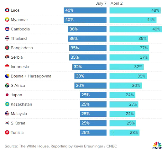美国总统特朗普周一透露,从8月1日起,至少14个国家的进口商品将面临高额关税。 ![]() 根据特朗普发布的信件,从日本、韩国、马来西亚、哈萨克斯坦和突尼斯进口到美国的商品现在将面临25%的关税。 南非和波斯尼亚的商品将被征收30%的美国关税,从印度尼西亚进口的商品将被征收32%的消费税。 总统在信中说,孟加拉国和塞尔维亚的关税税率均为35%,柬埔寨和泰国的关税税率为36%。 特朗普在Truth Social上发布的信件显示,从老挝和缅甸进口的商品将面临40%的关税。 特朗普签署的信件还说,美国“可能”会考虑调整新的关税水平,“取决于我们与贵国的关系”。 这些信件是周三之前发出的首批信件,他对数十个国家的所谓对等关税定于周三恢复到他在4月初宣布的更高水平。 白宫新闻秘书莱维特表示,未来几天将发出更多信件。 周一下午晚些时候,特朗普签署了一项行政命令,将周三的关税截止日期推迟到8月1日。该行政令称,特朗普“根据其他信息和多位高级官员的建议”做出了这一决定。 对大多数国家来说,美国的新关税税率与特朗普4月2日宣布“解放日”关税后它们面临的关税水平相当接近。 ![]() |