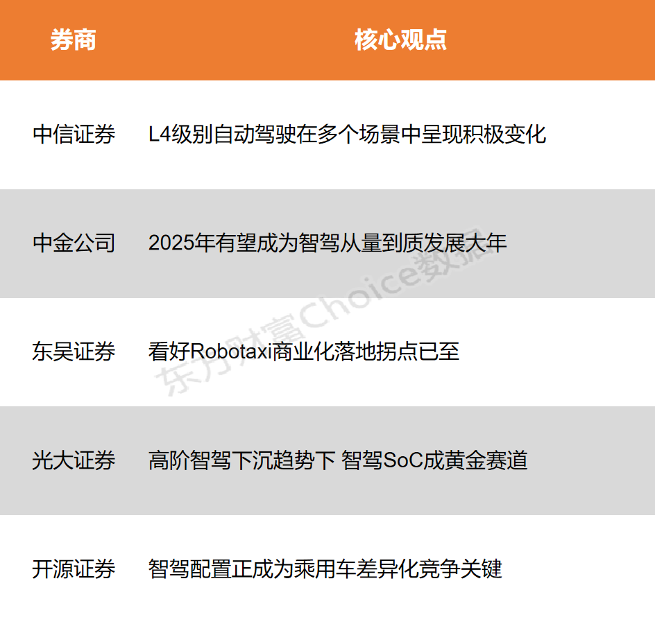 光大证券:高阶智驾下沉趋势下 智驾SoC成黄金赛道 汽车架构从集中式走向分布式,SoC芯片成为智能驾驶核心部件。2024年城市NOA迈入15万—25万元区间,2025年比亚迪推动“智驾平权”,有望推动高阶智驾下沉至10万元级车型。2025年15万以下车型城市NOA渗透率将迅速提升,对中高算力芯片需求持续提升。另外从智能驾驶的技术层面来看,2025年端到端新技术聚焦VLA与世界模型,“车位到车位”智驾功能成为各大车企竞争焦点,对芯片算力、方案商能力、主机厂自研等能力均提出更高要求。 开源证券:智驾配置正成为乘用车差异化竞争关键 智驾逐步开启商业化落地,限定ODD(设计运行域)和特定速度的无人驾驶有望率先实现商业闭环,尤其在物流、环卫等场景已显现优势。乘用车行业新品密集发布,显示智驾配置正成为差异化竞争关键。 (本文不构成任何投资建议,投资者据此操作,一切后果自负。市场有风险,投资需谨慎。) (文章来源:东方财富研究中心) |