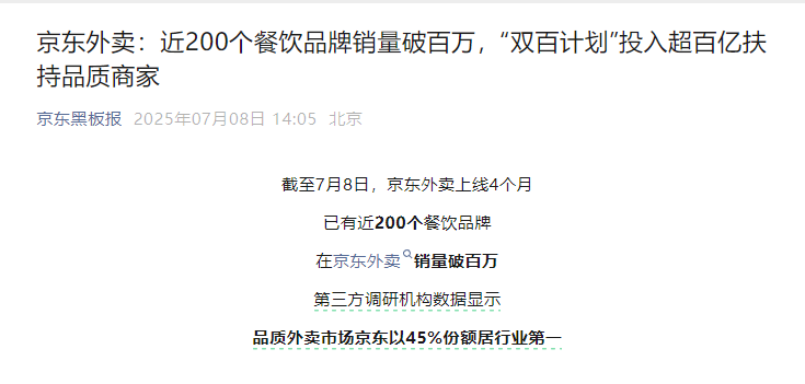 外卖大战升级态势明显。 7月8日下午,京东黑板报宣布,京东外卖上线4个月已有近200个餐饮品牌在京东外卖销量破百万。 同时,京东外卖宣布,正式启动“双百计划”,将投入超百亿元扶持更多品类标杆品牌销量破百万。这也被视为京东外卖加大商家端补贴力度的一大动作。 ![]() 实际上,此前,京东在消费者端就抛出了百亿补贴,这也是其餐饮品牌销量大增的一大背景。近期阿里、美团外卖也纷纷加大对消费者的补贴力度。 数据显示,截至7月5日22时54分,美团即时零售当日订单已经突破了1.2亿单,其中,餐饮订单已超过1亿单,占比高达83.3%。7月7日,淘宝闪购、饿了么联合宣布:日订单数超8000万;非餐饮订单超1300万;淘宝闪购日活跃用户超过2亿。 对此,百福控股(01488.HK)总裁王小龙对证券时报记者表示,“几家外卖平台为吸引流量展开激烈的补贴竞争,像奶茶、咖啡这种客单价低的品类因此获得较大增长。总体来看,短期内这对消费者和部分商家是利好。但从长期来看,一些商家在线上陷入赔本赚吆喝的状态。平台要为餐饮等行业提供价值,不能一味追求低价,相信外卖行业最终会进入稳定期,最理想的状态是实现平台、商家与消费者的三方共赢。”