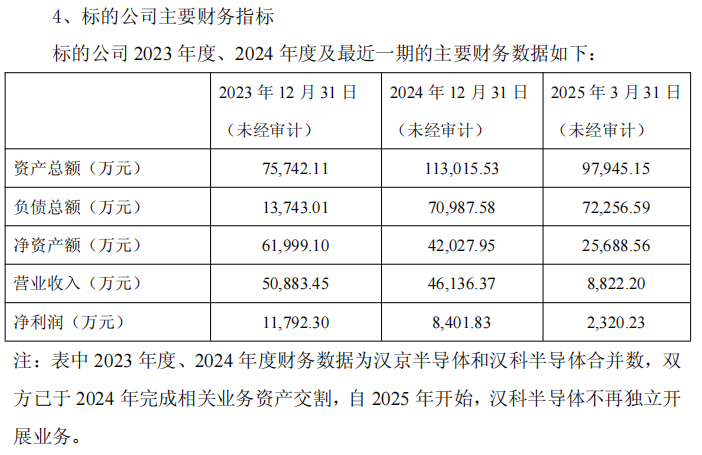 7月8日,正帆科技(证券代码:688596)发布公告称,拟以现金方式收购辽宁汉京半导体材料有限公司(以下简称汉京半导体)5名股东持有的62.23%股权,交易完成后,汉京半导体将成为其控股子公司,这一动作旨在提升正帆科技在半导体高耗零部件领域的竞争力。 正帆科技表示,交易完成后,公司将为汉京半导体导入更多客户资源,同时在产品拓展、技术研发、运营能力等方面产生较强的协同效应,使公司在半导体核心零组件领域取得更大成长,推动OPEX业务发展。 根据初步调查以及相关规定,本次交易不构成关联交易,亦不构成重大资产重组。 ![]() 标的公司估值为18亿元 正帆科技已与标的公司汉京半导体及其5位股东签署《股权收购意向协议》,各方同意拟按照标的公司100%股权价值为18亿元估值转让62.23%的股权。按此估值计算,62.23%股权交易对价约为11.2亿元。 从股权结构看,本次交易涉及汉京半导体的5名股东,其中SINGAREVIVAL控股私人有限公司拟转让41.2%股权,沈阳秦科创业投资合伙企业拟转让11.6%股权,上海汉富集业咨询管理合伙企业、辽宁汉宥咨询管理合伙企业和辽宁唐科咨询管理合伙企业合计拟转让9.43%股权。收购完成后,汉京半导体将纳入正帆科技合并报表范围。 根据汉京半导体的主营业务情况,其同行业可比非上市公司的估值区间为市盈率(PE)15倍至36.8倍之间。按汉京半导体2024年净利润8401.83万元计算,本次对应PE为21.4倍,与市场估值情况相符。若考虑其承诺未来三年净利润3.93亿元,即平均每年1.31亿元计算,则对应PE为13.7倍。 ![]()