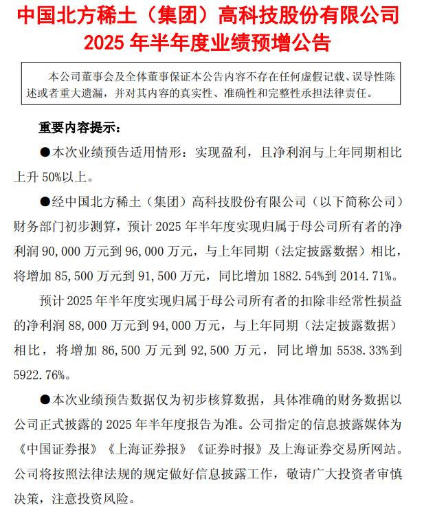 北方稀土7月9日公告, 预计2025年半年度实现归属于母公司所有者的净利润9亿元到9.6亿元,与上年同期相比,将增加8.55亿元到9.15亿元,同比增加1882.54%到2014.71%。预计2025年半年度实现归属于母公司所有者的扣除非经常性损益的净利润8.8亿元到9.4亿元,与上年同期相比,将增加8.65亿元到9.25亿元,同比增加5538.33%到5922.76%。 ![]()