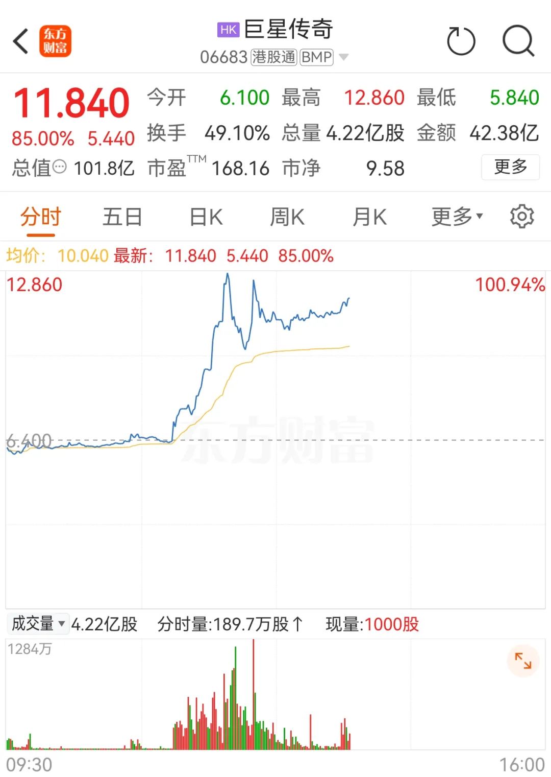 港股异动! 7月9日,“周杰伦概念股”巨星传奇的股价突然大幅拉升,盘中最高涨幅达到100%,市值突破100亿港元。当天,周杰伦正式入驻抖音,取名“周同学”。 巨星传奇是一家专注于IP创造及营运和新零售的港股主板上市公司,该公司与周杰伦、刘畊宏等明星深度绑定,目前已打造“周同学”、“刘教练”两大现象级明星IP。巨星传奇现有明星IP组合累计粉丝量已达2亿。 巨星传奇股价大涨 今日盘中,港股巨星传奇放量拉升,盘中最高涨幅一度达到100%,股价最高触及12.86港元。截至券商中国发稿,巨星传奇上涨85%,股价报11.84港元,市值为101.8亿港元。 ![]() 消息面上,7月9日,周杰伦正式入驻抖音平台,名称“周同学”,认证身份为歌手。抖音相关负责人表示账号属实,但针对网传的抖音花费9位数与周杰伦签约传言为谣言。截至下午14时左右,“周同学”抖音号的粉丝已突破300万。 公开资料显示,巨星传奇成立于2017年,是一家专注于IP创造及营运和新零售的港股主板上市公司。公司于2023年7月在港交所上市,于2024年2月获准纳入恒生综合指数成份股,2024年3月正式进入港股通,同年5月份被纳入MSCI全球小盘股指数。 财报显示,2024年,巨星传奇的收入为5.84亿元,同比增长35.75%;净利润为5605万元,同比增长62.4%。其间,公司IP创造及营运业务表现显著增长,主要是由于集团两大电视节目成功播出。据悉,由周杰伦主演的户外真人互动综艺节目“周游记2”于2024年上半年播出,反应热烈;以庾澄庆为中心的音乐脱口秀节目“乐来乐快乐”,于2024年6月至8月期间于浙江卫视及多个在线平台播出。该节目于同时段同类综艺节目中一直保持最高收视率,在微博上产生超过200个热搜,累计超过150百万条相关评论。 除电视节目外,巨星传奇亦筹办及策划多项在线及线下活动。例如,2024年,集团参与策划了“一千零一夜”综艺音乐节目,邀请多位明星参与,并于浙江卫视、快手及多个平台播出。集团亦筹办多项以刘畊宏为中心的活动,包括于2024年8月在鸟巢举办的“健身嘉年华”及于2024年12月在成都举办的演唱会。 2024年,公司新零售业务也持续增长,录得收入约2.7亿元,较2023年增长约12.5%。公司的旗舰产品——魔胴咖啡继续受消费者欢迎。根据灼识行业咨询有限公司的资料,魔胴咖啡于2024年继续在中国防弹饮料市场排名第一(按销售额及销量计)。