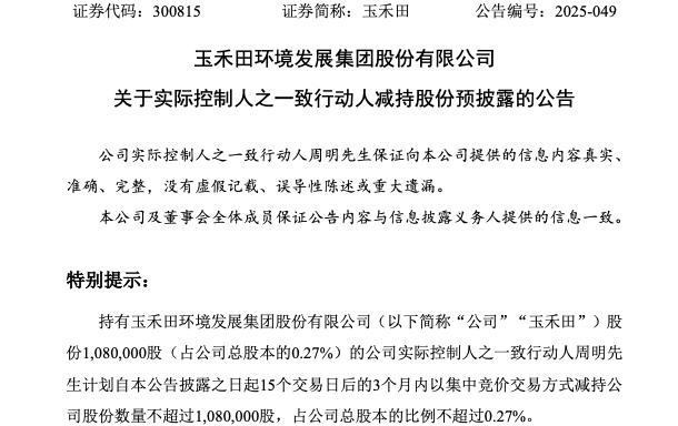 7月9日晚间,玉禾田(300815)发布公告,公司实际控制人之一致行动人周明计划以集中竞价交易方式减持公司股份数量不超过108万股。此次周明计划减持上限正是其所持公司的全部股份,这意味着周明或将“清仓”离场。 ![]() 来源:公司公告 公告显示,自公告披露之日起15个交易日后的3个月内(即2025年8月1日至2025年10月31日),周明拟减持数量总计不超过1080000股,占公司总股本不超过0.27%,若本公告披露之后公司发生送股、资本公积金转增股本等股份变动事项,上述减持股份数量按照减持比例不变的原则进行相应调整。周明所持股份来源为公司首次公开发行前已发行股份(包括首次公开发行股票后因权益分派转增的股份)。