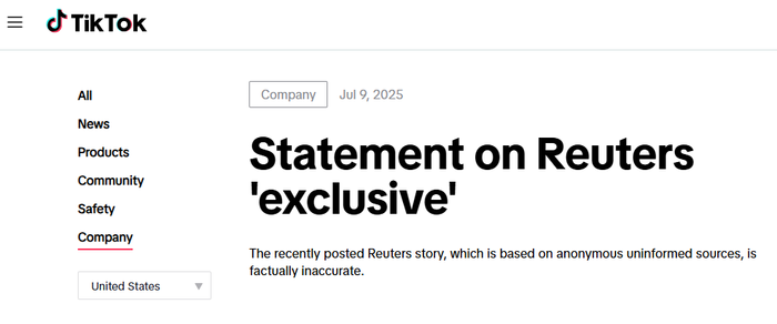 当地时间7月9日,TikTok发布公告称,路透社最近发布的一篇基于匿名、不知情信源的“独家”报道与事实不符。上述报道称,TikTok正在开发一款仅面向美国用户的独立应用程序,将“使用与全球版本不同的算法和数据系统”。TikTok没有在回应中做详细说明。 ![]() 此前,环球网7月8日援引美国媒体报道称,TikTok正为美国用户开发一款新应用程序,并计划于9月5日在美国应用商店上线。根据目前的时间表,旧款应用将于2026年3月停止服务。TikTok的美国用户必须下载新应用才能继续使用其服务。 据外交部网站,美国总统特朗普近日称,美国将于本周同中国谈TikTok的交易,并表示“我们基本上已达成协议,协议很可能需要中方批准,但也不一定”。对此,外交部发言人毛宁7月7日回应媒体询问称,“关于涉TikTok问题,中方已多次阐明原则立场”。此前,外交部曾在多次相关答问中阐明:中方将依据中国的法律法规处理相关问题;美方应为中国企业在美经营提供开放、公平、公正和非歧视的营商环境。 就TikTok在美相关事宜,中国商务部也明确表示,中国政府一贯尊重和维护企业合法权益,营造市场化、法治化、国际化一流营商环境,反对无视市场经济规律、强取豪夺、损害企业正当权益的做法。中方尊重企业间平等、自愿、公平的商业行为。具体商业安排必须符合中国法律,包括出口技术,须经中国政府依法审批。 近日,有消息称字节跳动已同意将TikTok美国业务出售给由甲骨文牵头的美国财团。对此,字节跳动方面回应多家中国媒体称,该信息不实。今年4月,字节跳动曾在一份公开声明中表示,公司尚在与美政府商谈之中,未达成任何协议,双方在很多关键问题上仍存分歧。“按照中国法律规定,任何协议均须经有关审查程序。”字节跳动称。