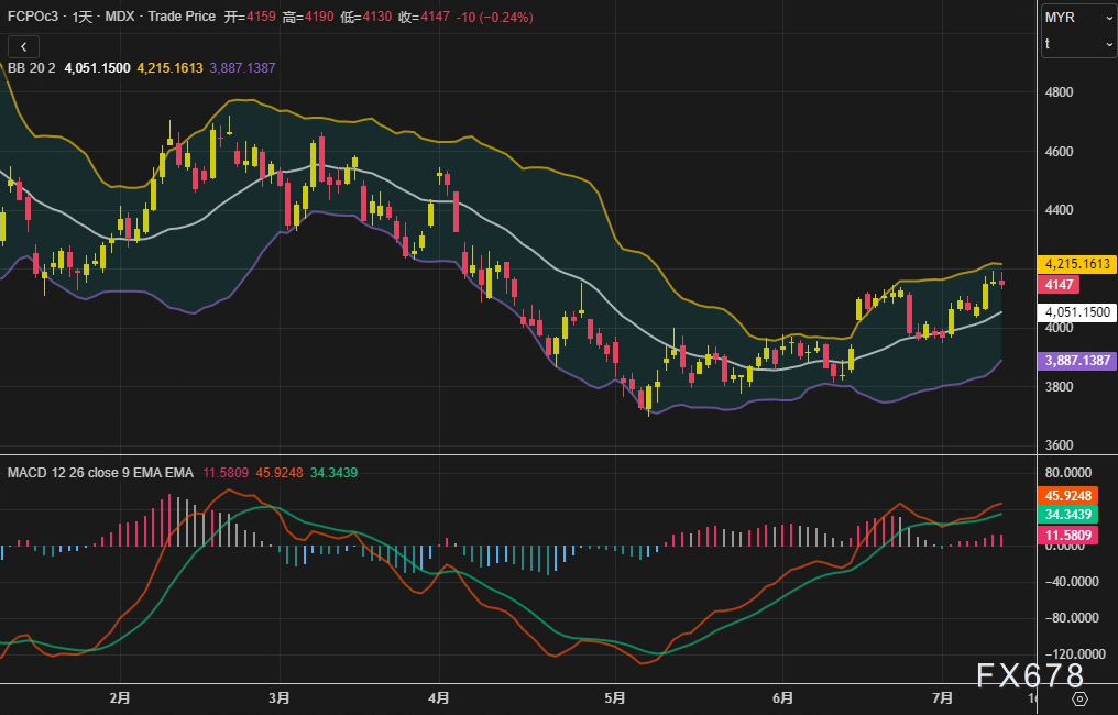 周四 7月10日 马来西亚衍生品交易所 BMD 棕榈油主力合约FCPOc3收报4147林吉特 吨 日内下跌0 24 结束此前三连涨 日线级别MACD指标呈现11 58的柱状线 快慢线间距收窄至34 34 布林通道中轨位于4051林吉 ...