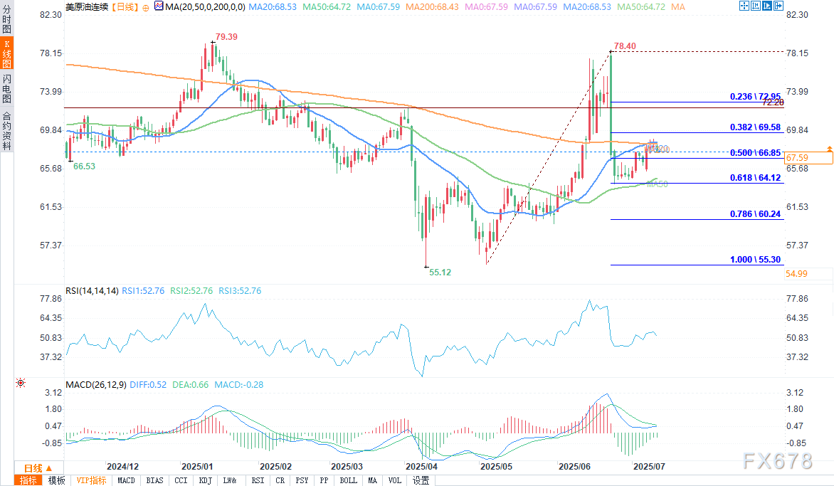 周四(7月10日)欧盘时段,WTI原油期货走跌,盘中报67.72美元每桶,跌幅0.97%,原油价格在日内呈现出较为明显的波动。价格围绕均价线(68.07 美元)上下波动,早盘价格在 68.28 美元附近开始,随后出现一定震荡下行走势,在盘中出现几次反弹尝试,但未能有效突破前期相对高位。市场处于观望状态,等待明确的看涨催化剂以突破当前低迷的交易区间。 ![]() 油价回落因美国总统特朗普重申关税威胁,包括针对巴西可能征收50%的出口关税,并暗示对铜、半导体和制药业采取更广泛措施。尽管市场因过去关税威胁常被撤销而打折扣,但交易者仍保持谨慎,因关税风险可能减缓全球经济增长,抑制石油需求。 美联储会议纪要显示,短期内降息意愿有限,政策制定者担心潜在关税带来的通胀压力。更高的利率会增加借贷成本,降低石油需求和更广泛市场的风险偏好,使交易者保持防御姿态。 欧佩克生产计划与供应不确定性 尽管欧佩克+宣布进一步增产计划,但市场对其实际供应增加的实现持怀疑态度。俄罗斯因基础设施问题面临供应限制,部分成员国已超过配额。 欧佩克的长期展望显示需求持续增长: 预计2025年全球石油需求达1.05亿桶/日,2029年增至1.116亿桶/日。这一预测远高于国际能源署(IEA)的观点,IEA认为2029年需求将达峰值1.056亿桶/日。 两者的分歧凸显了供需平衡的不确定性。 需求韧性的支撑因素 支持市场的积极因素包括: 美国能源信息署(EIA)报告显示,上周美国汽油需求上升6%,达920万桶/日。 7月初全球每日航班创下10.76万架的纪录。 港口和货运活动显示贸易持续扩张,强化了需求稳定性,尽管更广泛的宏观经济风险仍施加压力。 技术分析 ![]() WTI日线图显示,月初价格从5月趋势线反弹,今日正试图突破200日移动平均线。初步阻力位于5月来走势的38.2%回撤位69.58美元,在此之上的是4月高点72.28美元。 若WTI未能上破200均线,油价可能下滑至50日均线64.72美元,该位置或成为买家重新入场的长期价值区域,为技术性反弹提供潜在支撑。 ![]() |