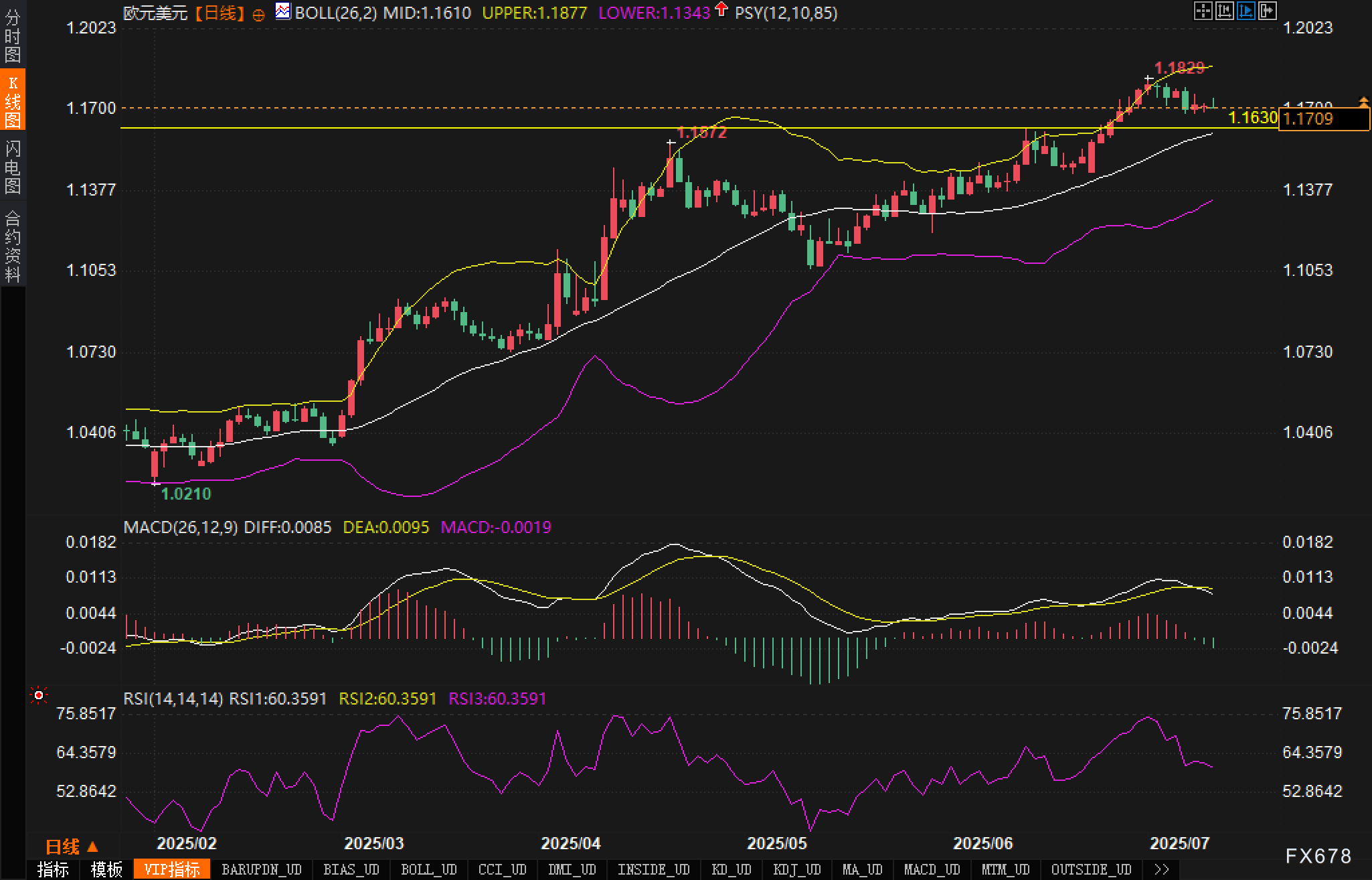 周四(7月10日),欧元/美元在亚洲与欧洲早盘一度上攻至1.1750关口附近,但未能有效突破,随后回落至1.1700上方小幅整理。当前市场情绪受到国际贸易不确定性拖累,风险偏好明显降温,避险属性较强的美元获得支撑。 ![]() 从基本面看,欧元区方面,德国6月消费者物价指数(CPI)数据维持月度持平,年率回落至欧洲央行的2%目标,通胀动能乏力令欧元短线承压。据路透,尽管欧盟与美国的贸易谈判出现积极信号,美国总统特朗普对欧盟“建设性的态度”表示认可,并暗示协议或即将达成,欧洲贸易专员塞夫科维奇亦释放乐观言论,但市场对谈判结果持谨慎态度。 美国方面,美联储会议纪要显示多数FOMC成员倾向在未来数月内降息,认为关税对通胀的影响属暂时性,同时对劳动力市场的持续放缓表示担忧。此外,周三美国10年期国债拍卖需求强劲,带动收益率回落,减缓了美元涨势。目前CME利率观察工具显示9月降息25个基点的概率从会议纪要发布前的65%跃升至72%。 整体来看,欧元短线走势受多重因素交织影响,市场情绪摇摆不定,而美元在避险买盘和宽松预期之间保持震荡。 技术面: 从日线图来看,欧元/美元自低点1.0210启动上涨趋势以来,形成稳定的上升通道,并连续站稳于布林中轨(当前1.1610)上方。近期一度上冲至年内高点1.1829,但随后出现高位震荡整理。 ![]() 相对强弱指数(RSI)自75高位回落至60一线,短期内动能处于偏弱状态,存在进一步调整空间。分析认为若汇价跌破1.1630及布林中轨1.1610的支撑区域,进一步支撑见于前期高点1.1572。 市场情绪观察 从市场情绪角度观察,当前风险偏好情绪显著回落,市场对贸易谈判的积极预期未能掩盖全球增长放缓与政策不确定性所带来的焦虑情绪。分析认为美联储释放鸽派信号并未引发明显的美元抛压,反映出在降息周期临近的同时,全球资本流动更倾向于美元资产。 欧元方面,尽管技术走势长期向上,但基本面未出现足以驱动持续升值的增量信息,市场对欧洲通胀疲软与增长乏力依旧敏感,限制了欧元的反弹空间。整体市场情绪呈现“高位震荡、观望为主”的特征,流动性尚可但缺乏明确方向。 后市展望 短期展望: 分析认为若欧元/美元持续在1.1700上方整理,可视为对前期涨势的正常修正,后市有望再次挑战1.1750和1.1829高点。但若跌破上述关键支撑,技术面或转向更深层次的回调,目标指向1.1500区域。 中长期展望: 中期趋势维持多头结构未变,布林带未出现收口迹象,说明当前回调属趋势中的阶段性修正。分析认为若美联储实际启动降息周期,且欧盟与美国贸易关系趋于缓和,欧元有望逐步摆脱当前整理区间,冲击1.19甚至1.20整数关口。但若欧洲经济增长预期持续低迷,需警惕趋势反转风险。 ![]() |